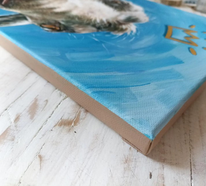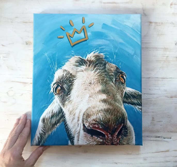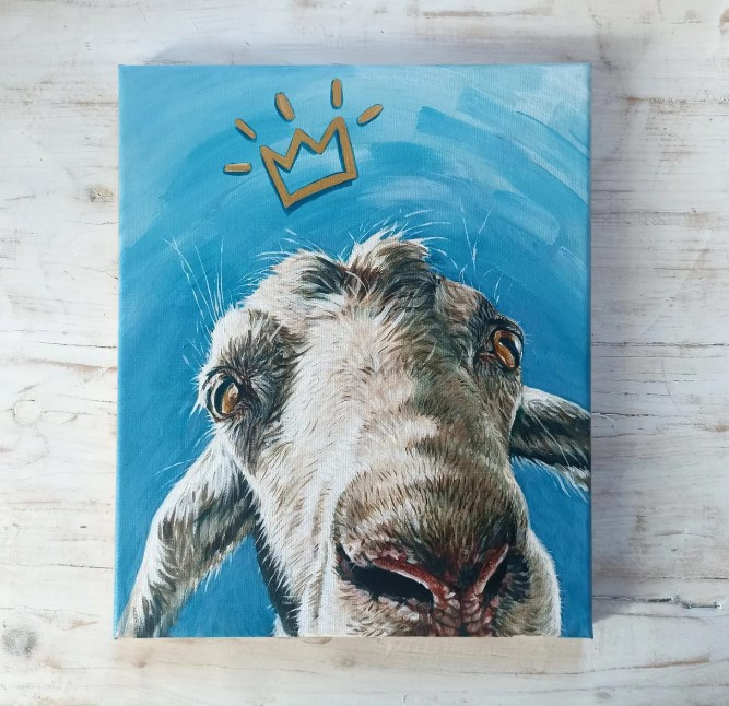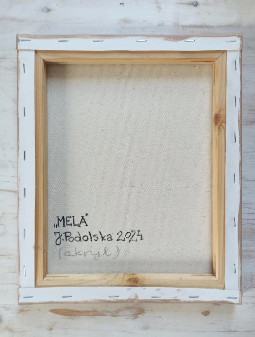 Obraz przedstawia portret wesołej, zaglądającej w kadr kozy o imieniu Mela. Obraz namalowałam farbami akrylowymi na podobraziu bawełnianym 24x30cm, boki zamalowane, werniksowany, podpisany na odwrocie, rok powstania 2024.