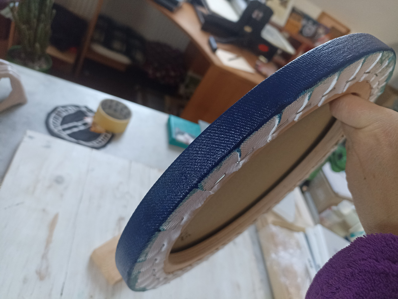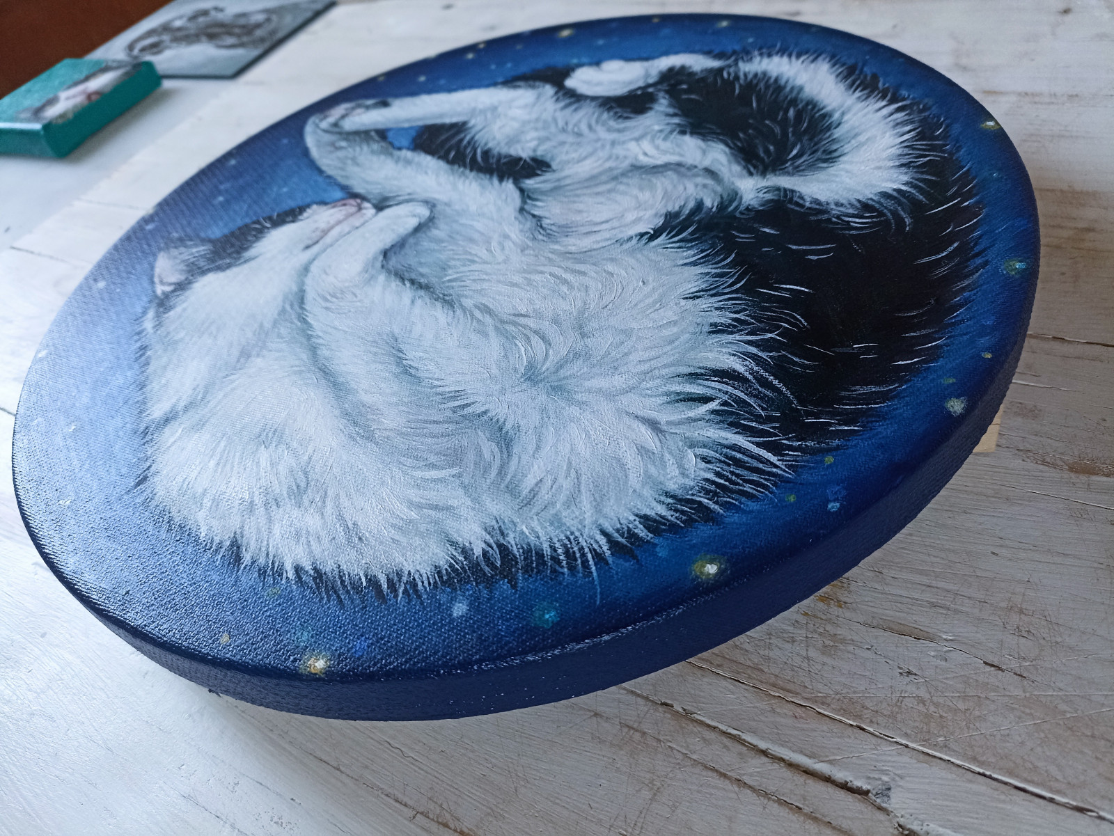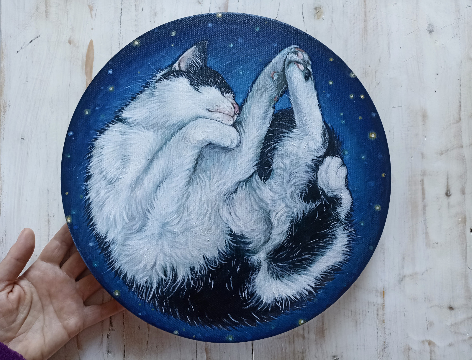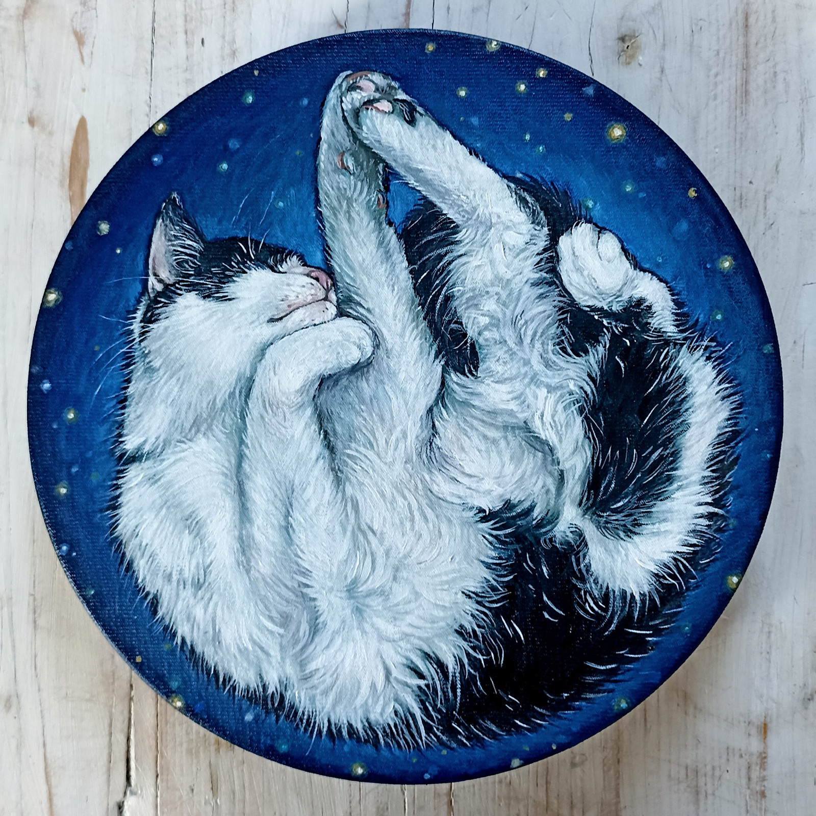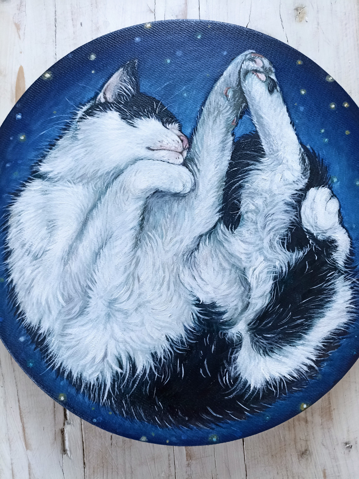 Obraz olejny ręcznie malowany na okrągłym podobraziu, obraz przedstawia śpiącego czarno białego kota na granatowym tle kojarzącym się z rozgwieżdżonym niebiem / kosmosem. całkowita szerokość obrazu to 30cm, werniksowany, podpisany na odwrocie, boki zamalowane w kolorze obrazu - wygląda dobrze bez oprawy, płótno na bokach podobrazia jest bardzo dobrze naciągnięte i nie marszczy się.