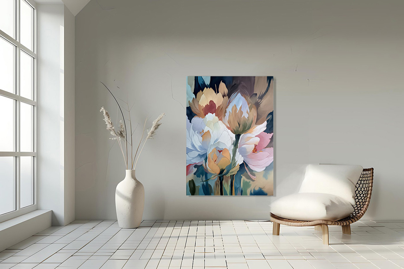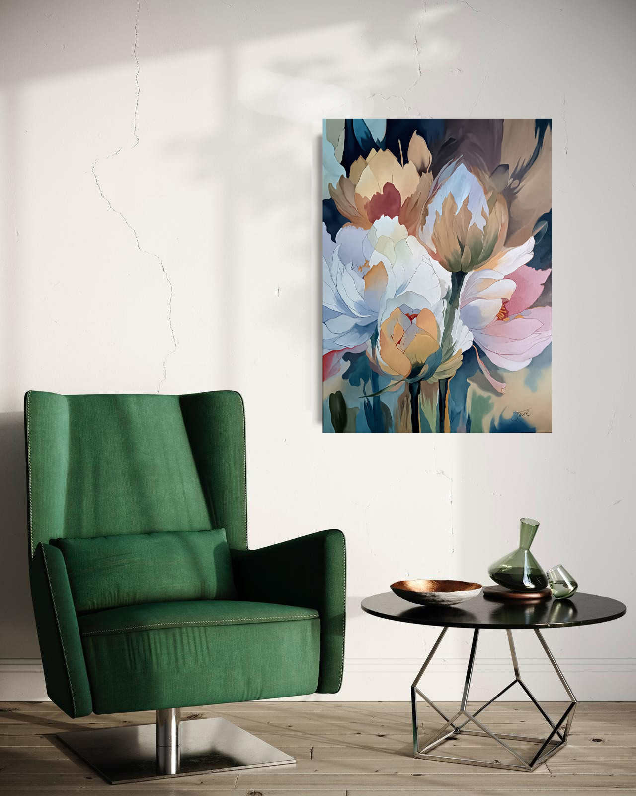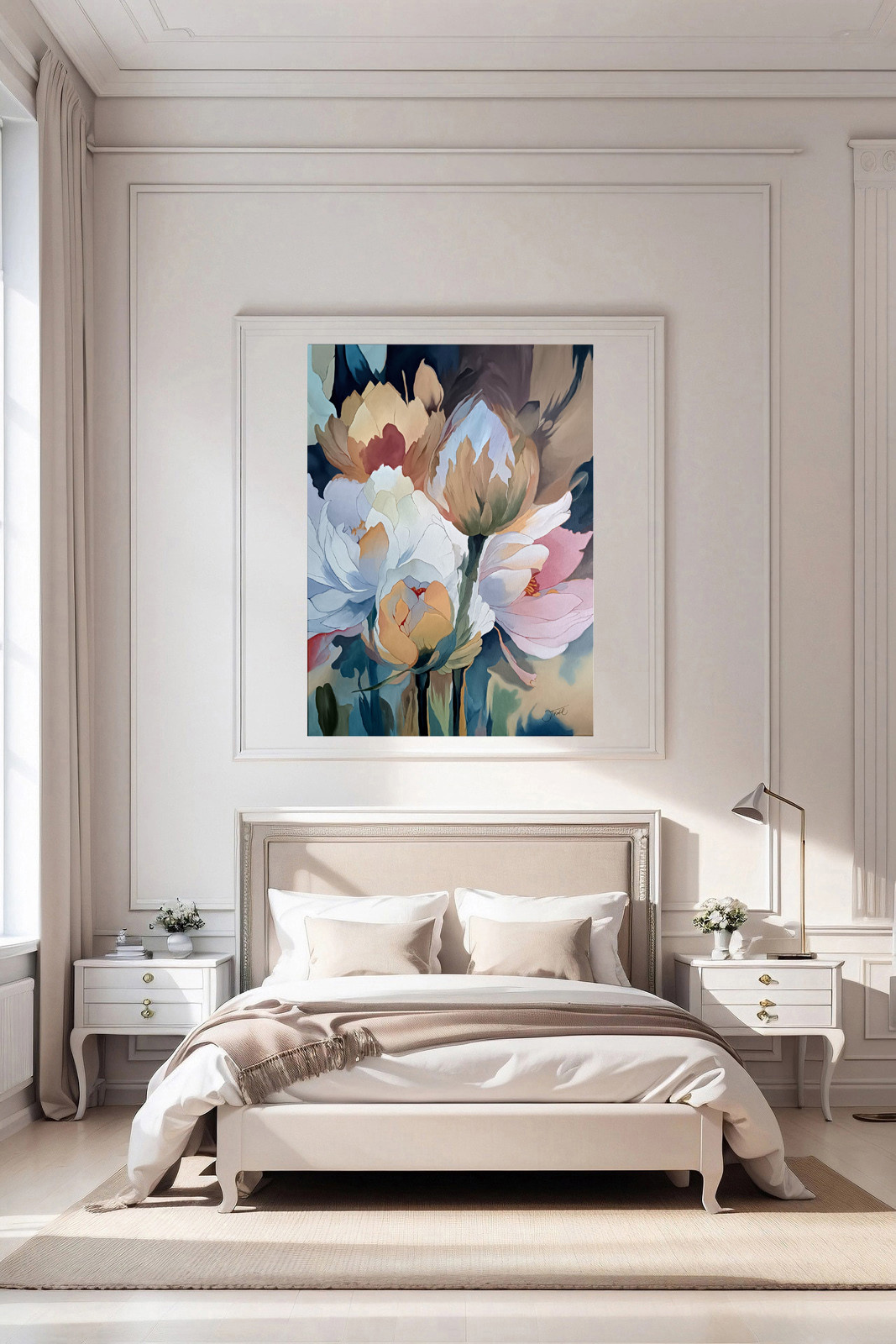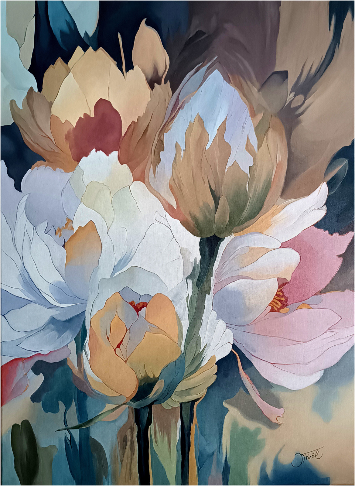 Obraz malowany techniką olejną na płótnie naciągniętym na drewniany blejtram, wymiary 97 x 70 cm. Przedstawia kwiaty potraktowane w kierunku abstrakcji. Boki pomalowane pod kolor tła obrazu. Zabezpieczony werniksem satynowym. Doskonale nadaje się do klasycznego jak i do nowoczesnego wnętrza. Wysyłka kurierem, bezpiecznie zapakowany. Zapraszam i serdecznie polecam :) Realizacja do 7 dni. Niech zagości w Twoim wnętrzu :)