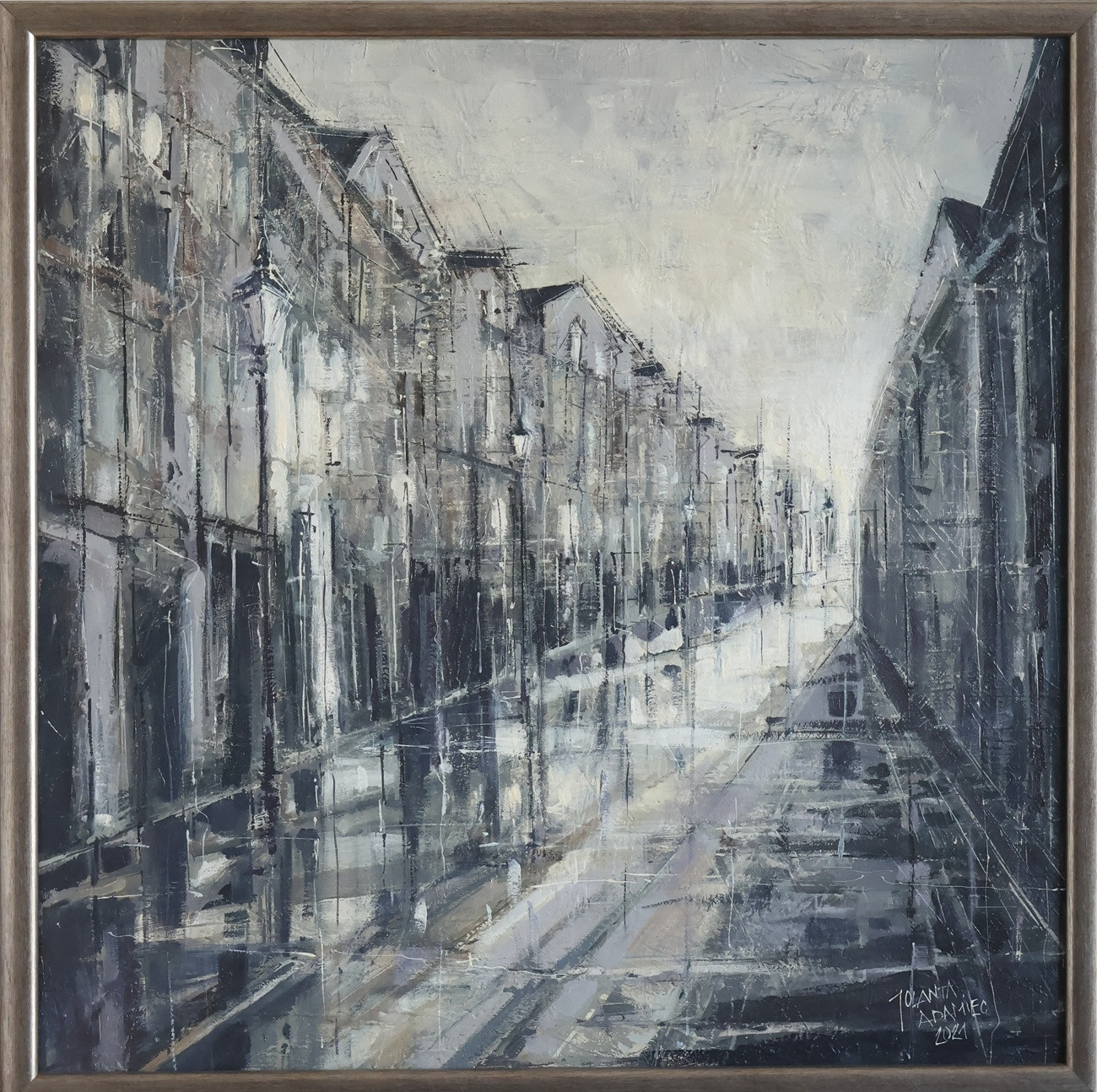 Obraz namalowany w 2021 na płótnie o wymiarach 60x60 sygnowany, oprawiony w ramę, gotowy do powieszenia. Należy do cyklu pt. Ulice świata malowanego od 2014 roku. Pasuje do każdego rodzaju wnętrz, do sypialni, salonu , domowej biblioteki.