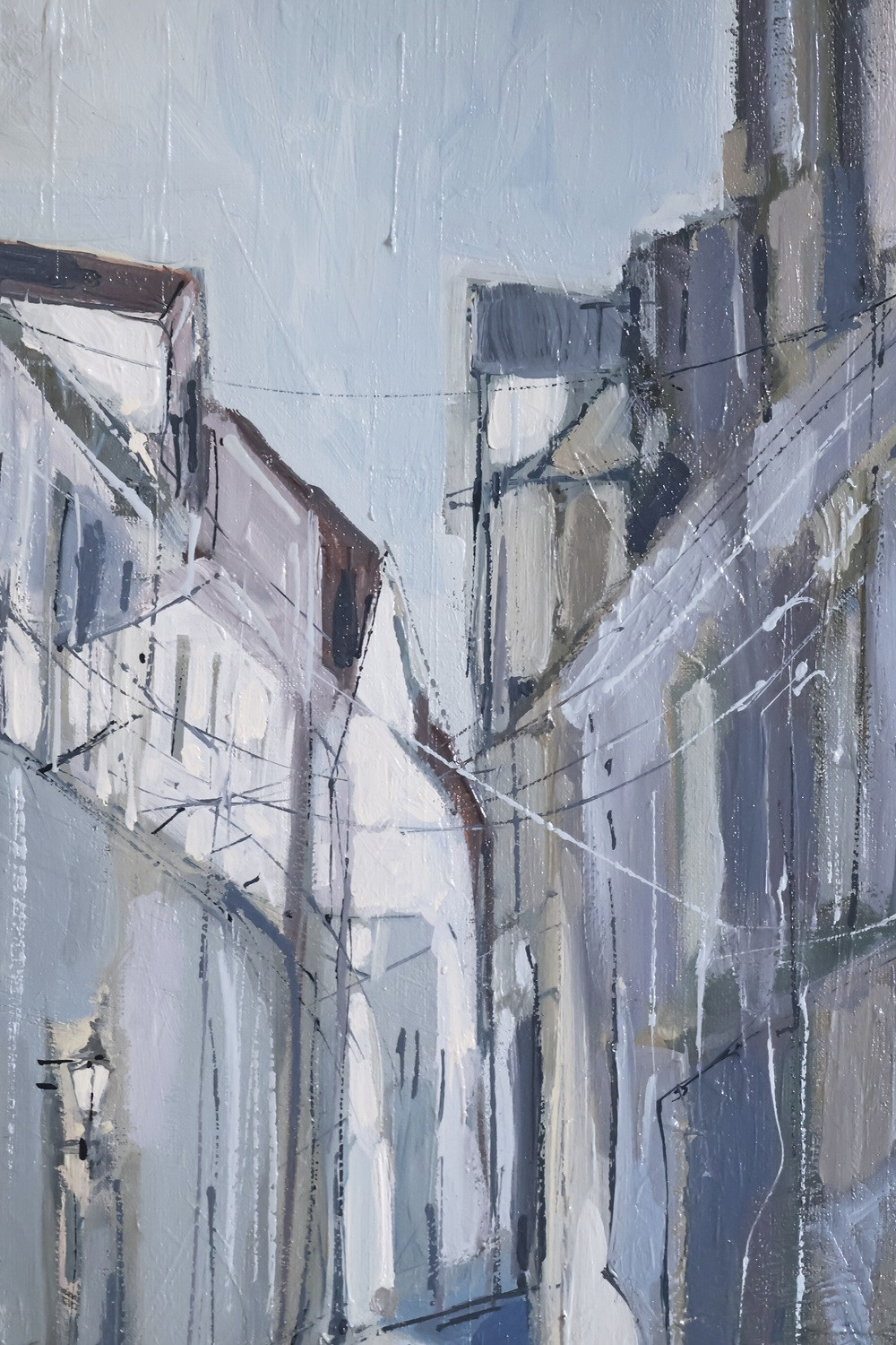 Jasno niebieskie i rozbielone szarości pasują do nowoczesnego wnętrza, do dużego przestrzennego salonu, sprawiając wrażenie dodatkowej głębi. Prostota, harmonijność i rytmiczność sprawia że obraz wycisza, uspokaja i odpręża....można usłyszeć własne myśli? Całość zamyka prosta rama, kadrując ulicę.