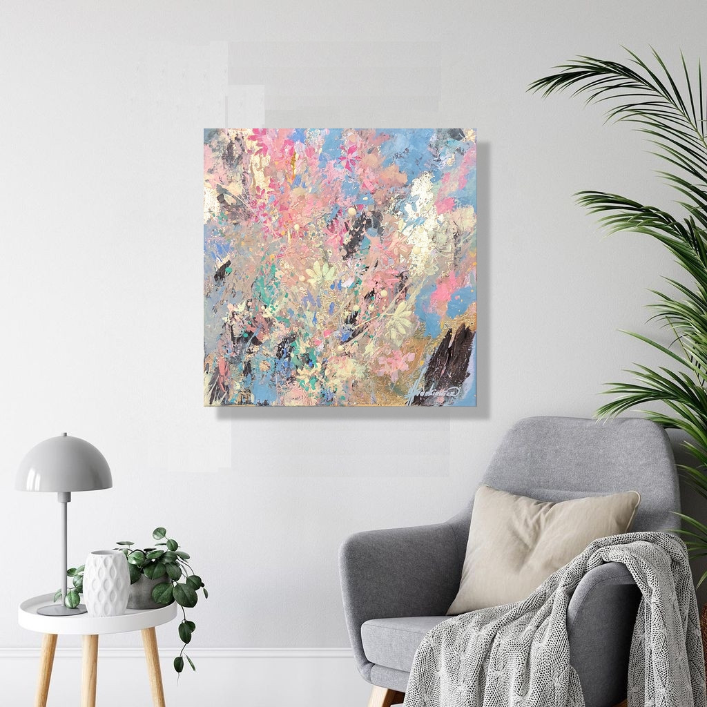Obraz malowany farbami akrylowymi na płótnie bawełnianym. Abstrakcja pełna impastów i wariacji barw , Kolorystyka pastelowa .