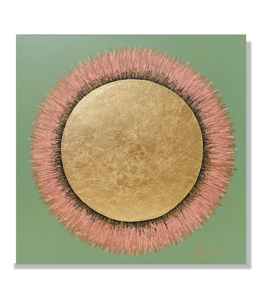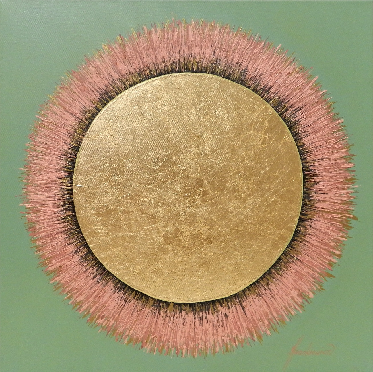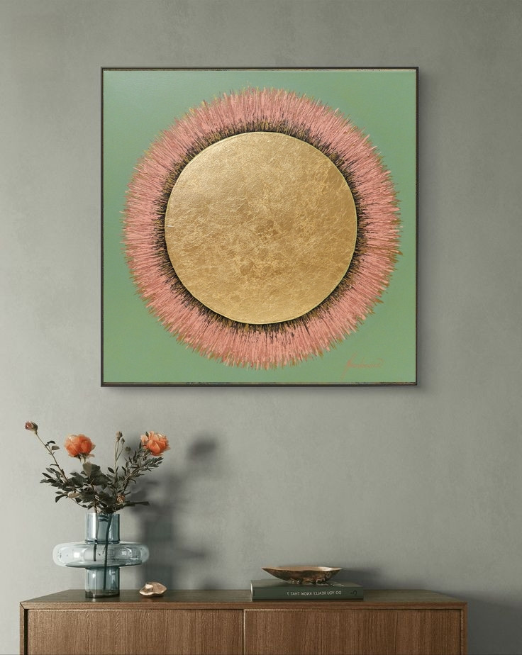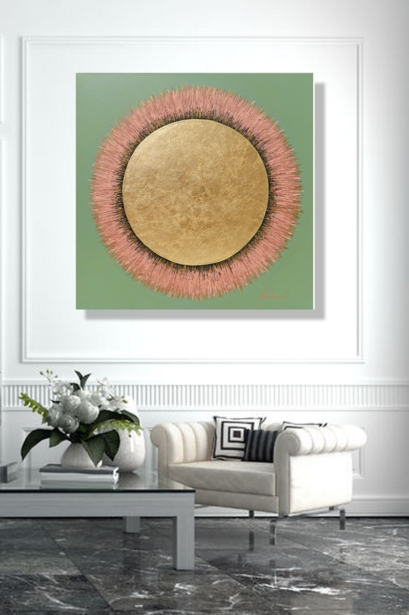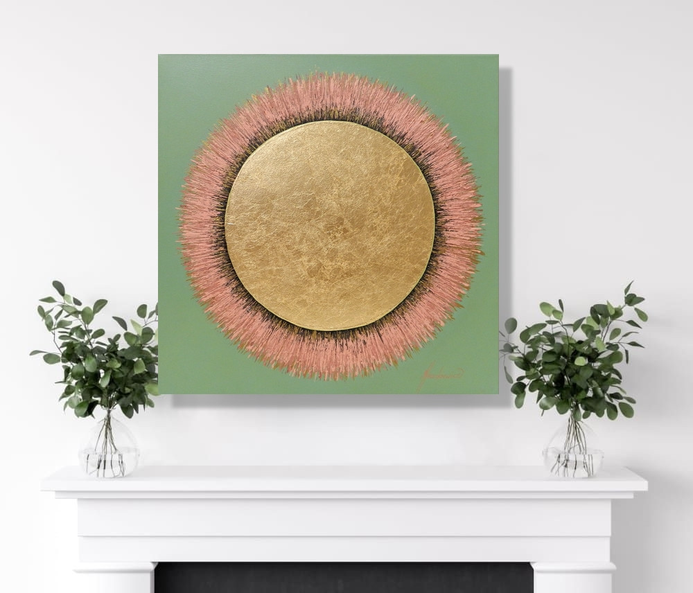 ..Mint and rose terracota ,,obraz z autorskiego cyklu ,, Metallic Energy,, Minimalizm w Ruchu: Cykl Metallic Energy to esencja nowoczesności. Choć formy pozostają minimalistyczne, to użycie złota, i metalicznych tonacji sprawia, że tła moich obrazów zdają się wibrować. Prace reagują na każdy Twój ruch i każdą zmianę światła w pomieszczeniu, ożywiając przestrzeń subtelnym, metalicznym rytmem.Abstrakcyjny obraz akrylowy malowany na płótnie.