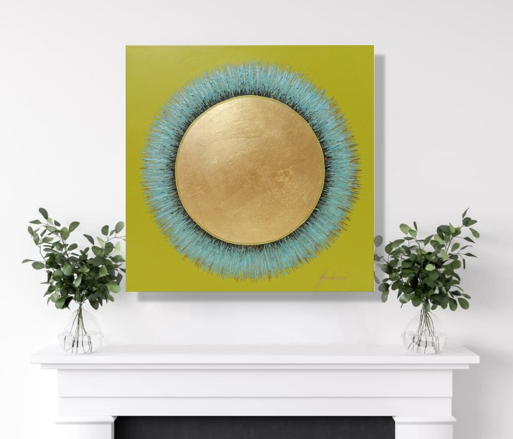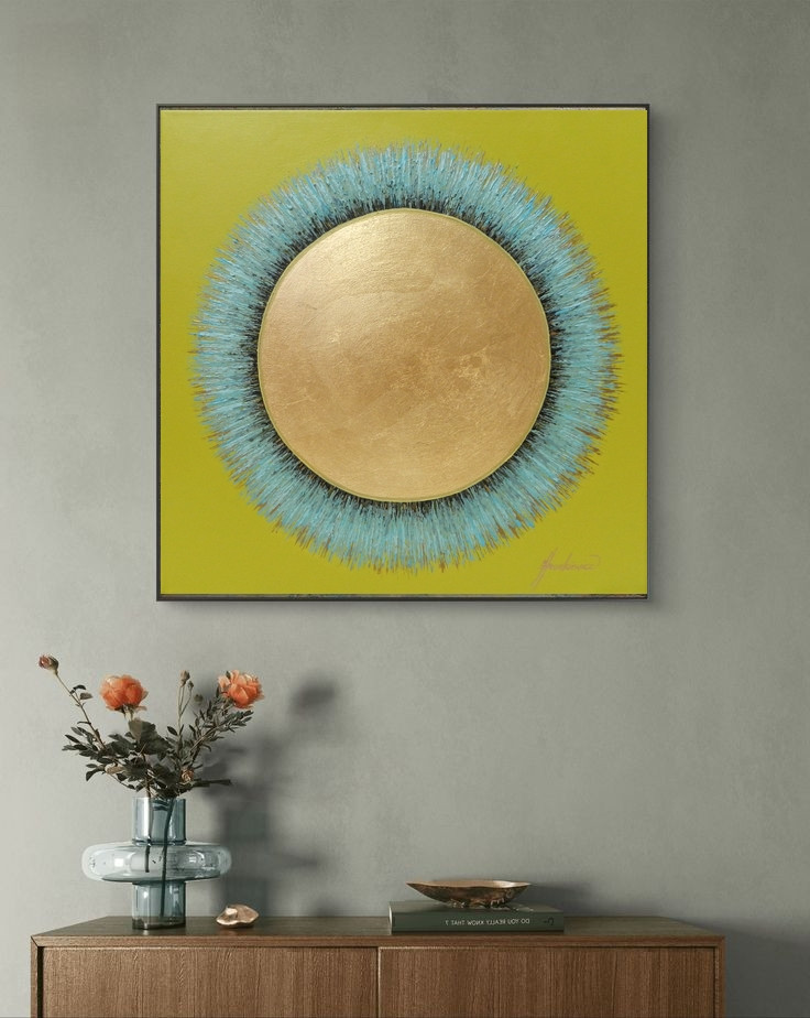 ..Niebieski ,,obraz z autorskiego cyklu ,, Metallic Energy,, Minimalizm w Ruchu: Cykl Metallic Energy to esencja nowoczesności. Choć formy pozostają minimalistyczne, to użycie złota, i metalicznych tonacji sprawia, że tła moich obrazów zdają się wibrować. Prace reagują na każdy Twój ruch i każdą zmianę światła w pomieszczeniu, ożywiając przestrzeń subtelnym, metalicznym rytmem.Abstrakcyjny obraz akrylowy malowany na płótnie.