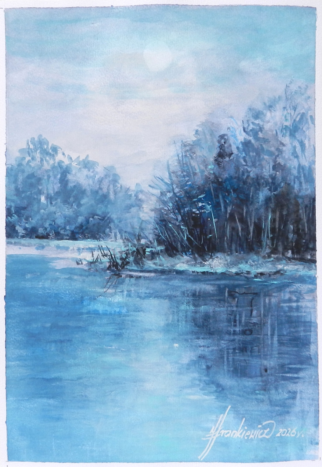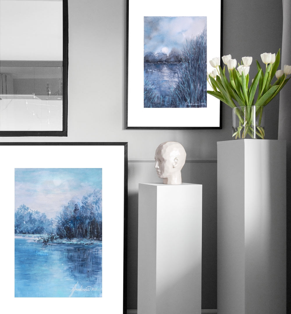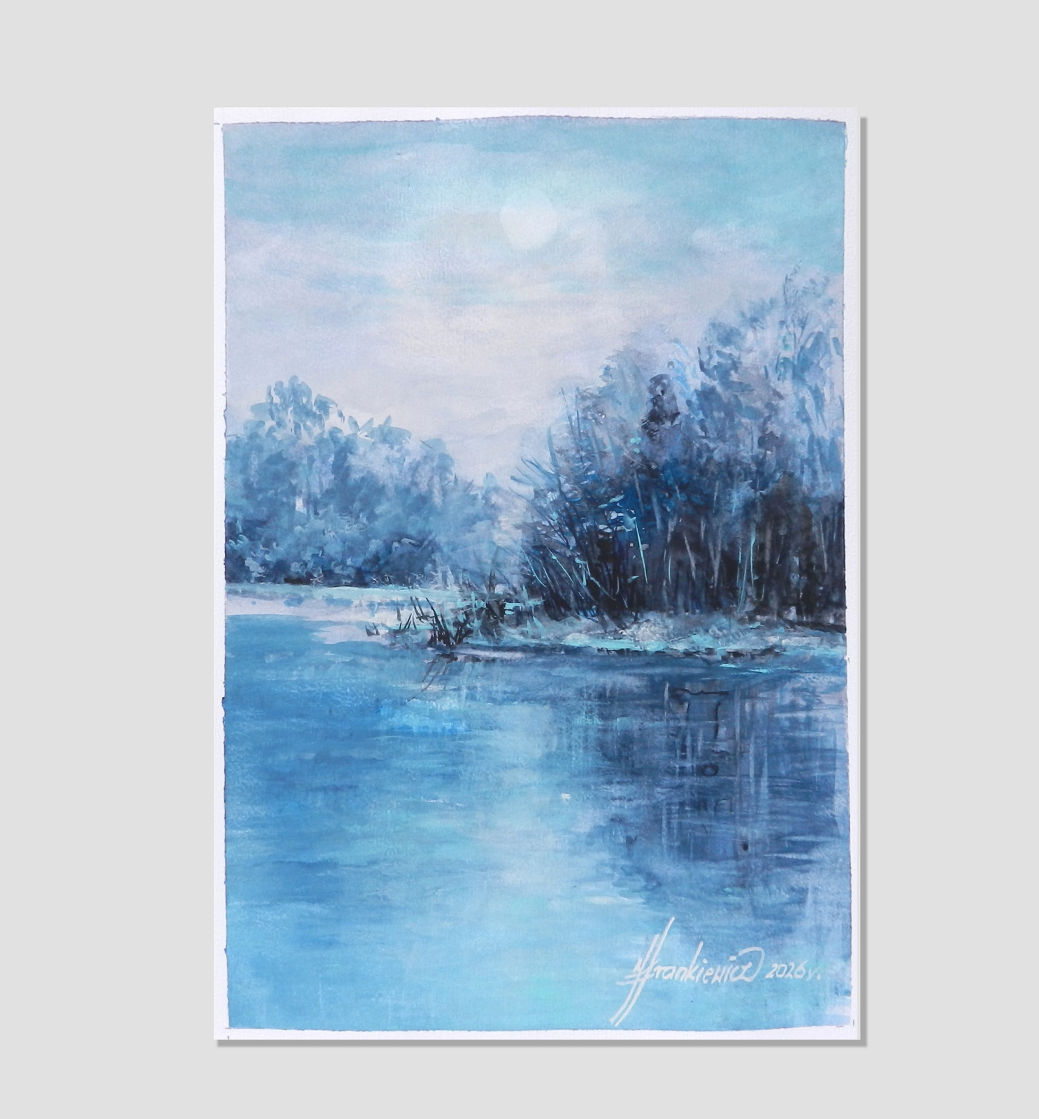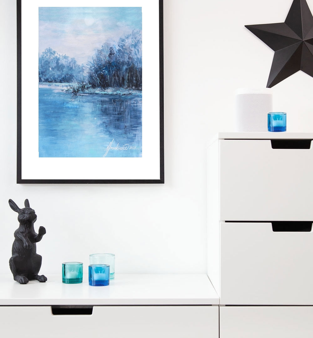 ,,Indygo ,,– minimalistyczna akwarela monochromatyczna na papierze artystycznym o grubości 300 g/m2. Format A4 (21x29,7 cm). Monochromatyczny minimalizm .Pejzaż w kolorze indygo , oparty na surowym kontraście barw. Praca posiada autorski, naturalny margines (ok. 0,5 cm) ze śladami procesu tworzenia, podkreślający jej unikatowy charakter. Oryginalna praca,sygnowana przez artystkę na licu oraz na odwrocie, zabezpieczona werniksem. Idealna do nowoczesnych, surowych wnętrz. Wysyłka w bezpiecznym, kartonowym opakowaniu, gwarantującym nienaruszony stan papieru.