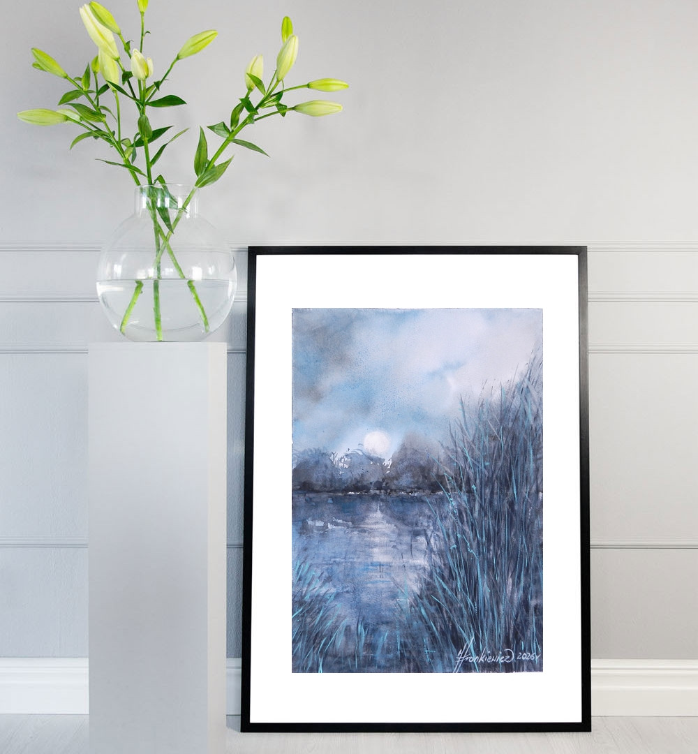 ,,Niebieski ,,– minimalistyczna akwarela monochromatyczna na papierze artystycznym o grubości 300 g/m2. Format A4 (21x29,7 cm). Obraz wykonany tradycyjną techniką akwareli w monochromatycznej tonacji błękitu. .Minimalizm, oparty na surowym kontraście barw. Praca posiada autorski, naturalny margines (ok. 0,5 cm) ze śladami procesu tworzenia, podkreślający jej unikatowy charakter. Oryginalna praca,sygnowana przez artystkę na licu oraz na odwrocie, zabezpieczona werniksem. Idealna do nowoczesnych, surowych wnętrz. Wysyłka w bezpiecznym, kartonowym opakowaniu, gwarantującym nienaruszony stan papieru.