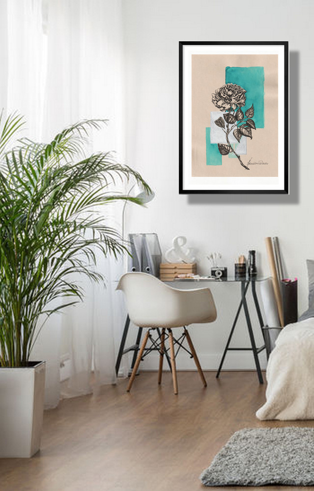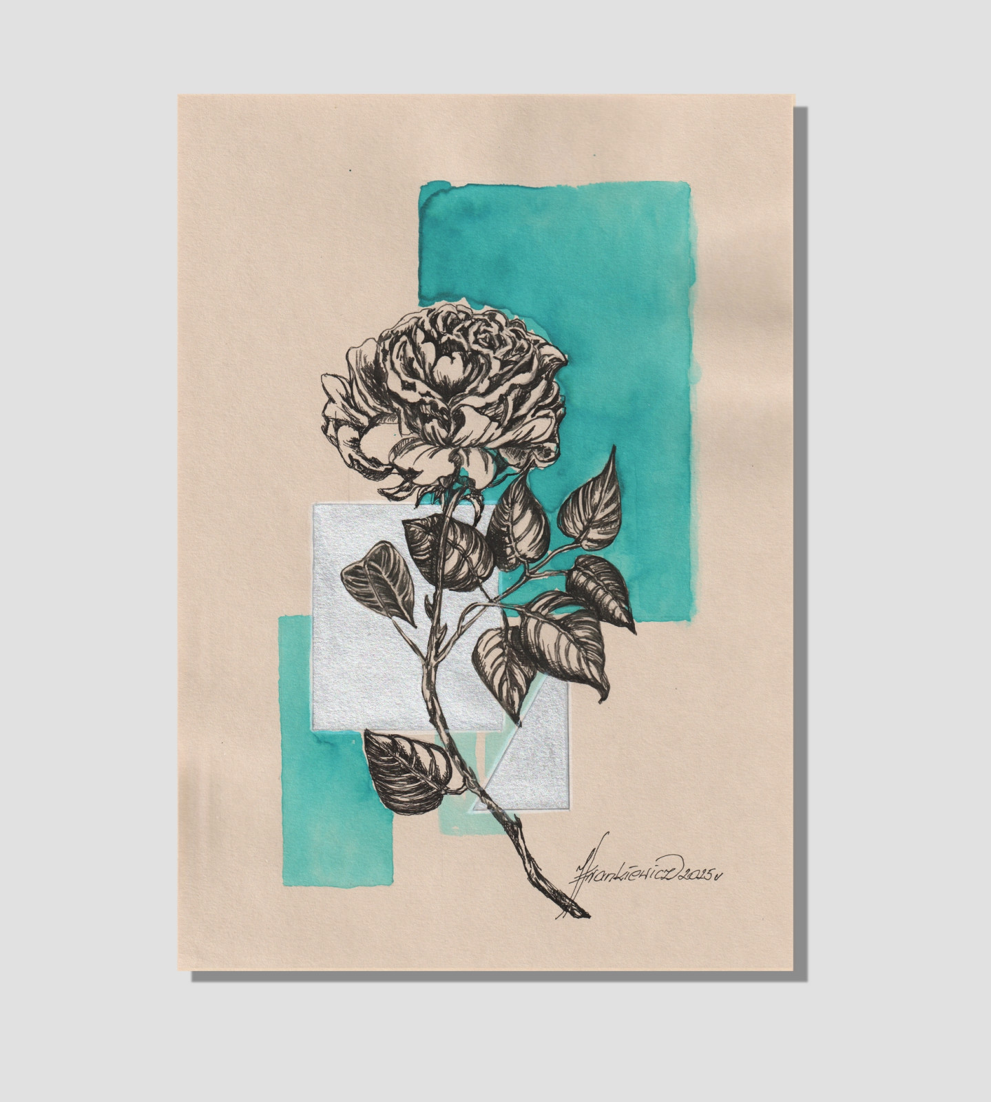,, Księżycowa róża ,, to nostalgiczny rysunek przedstawiający kwitnący kwiat róży .Obraz wykonany tradycyjną techniką tuszu i akwareli na profesjonalnym papierze artystycznym o naturalnym beżowym zabarwieniu .