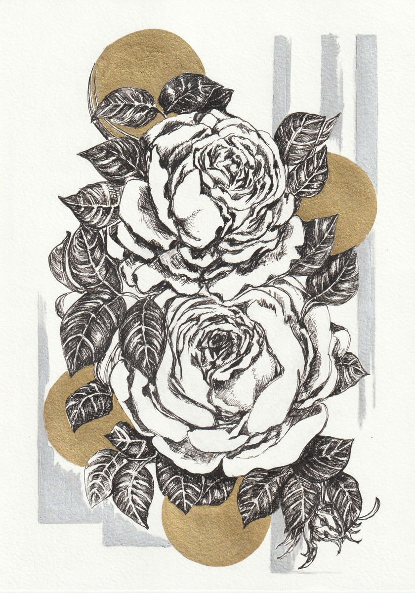 ,, Róże ,, - nostalgiczny rysunek , wykonany tradycyjną techniką tuszu na profesjonalnym , białym papierze artystycznym ..