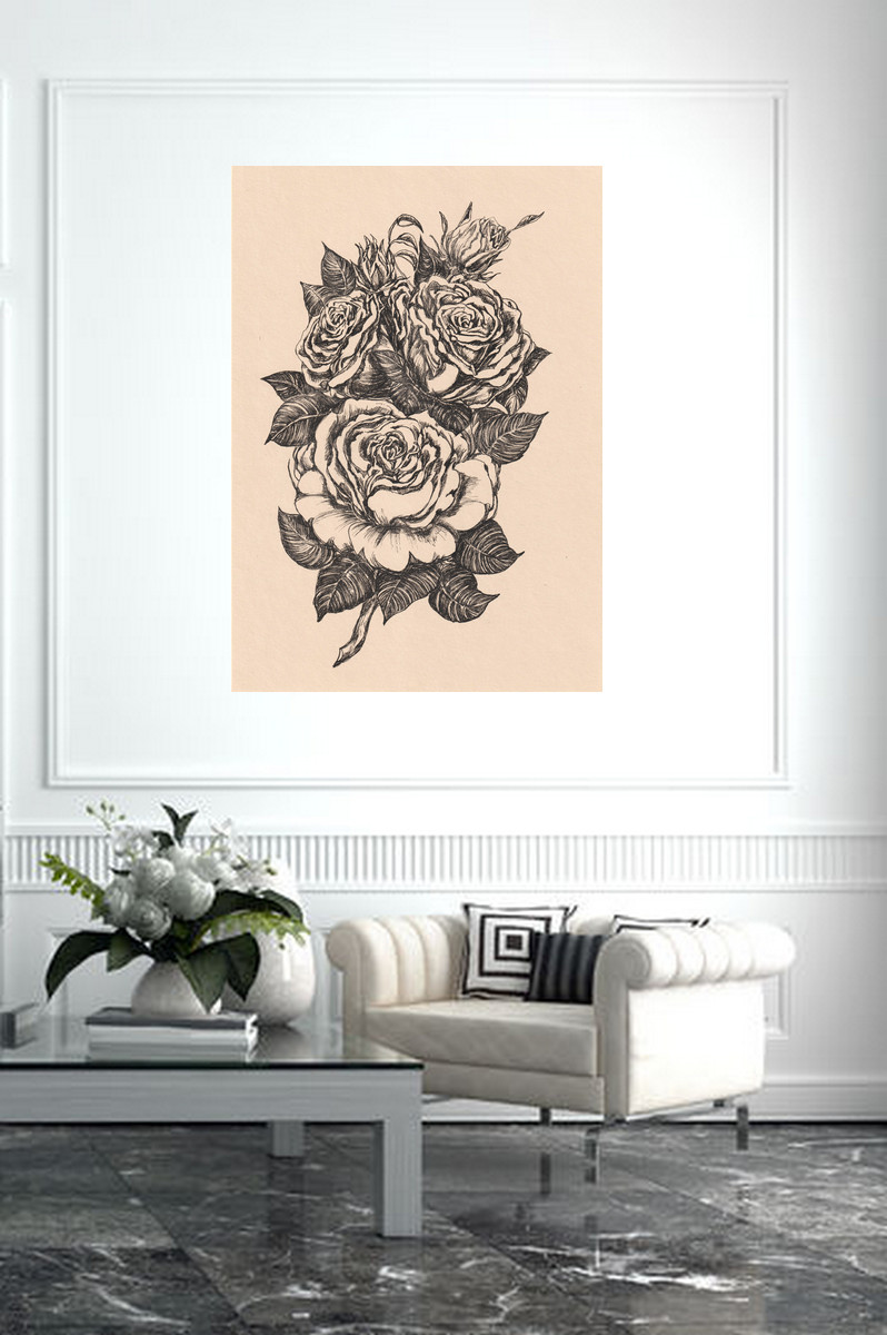 ,, W kawiarence ,, to nostalgiczny rysunek przedstawiający kwitnący kwiat róży .Obraz wykonany tradycyjną techniką tuszu na profesjonalnym papierze artystycznym o naturalnym beżowym zabarwieniu .