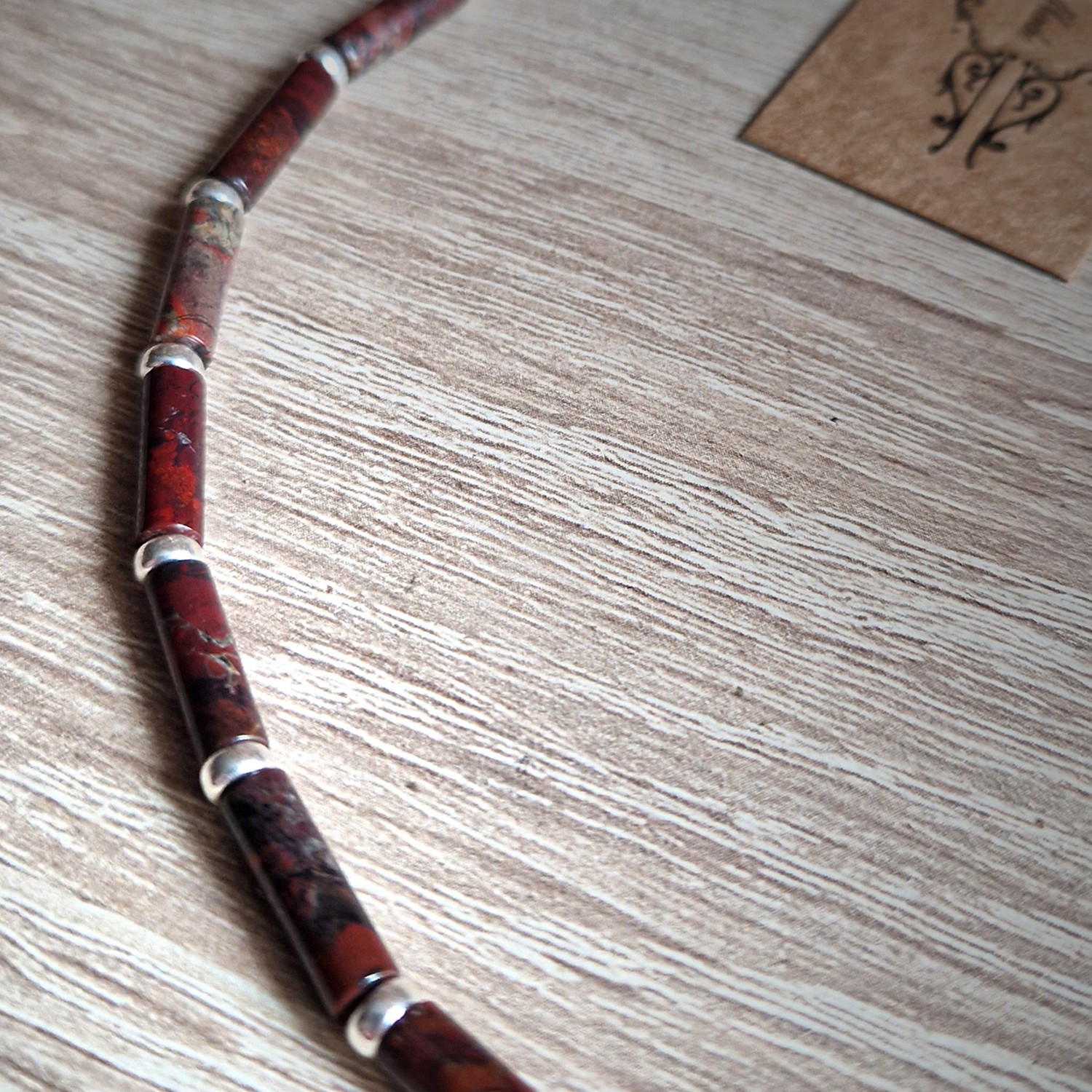 Naszyjnik autorski z kolekcji męskiej. Wykonany z wałeczków Jaspisu mahoniowego z Brazylii wielkości 13 mm x 4 mm, poprzeplatanego oponkami ze srebra 925 wolnego od niklu wielkości 4 mm. Całość na mocnym nośniku z linki jubilerskiej japońskiej. Wykończenie naszyjnika ze srebra 925 wolnego od niklu. Długość około 48 cm.