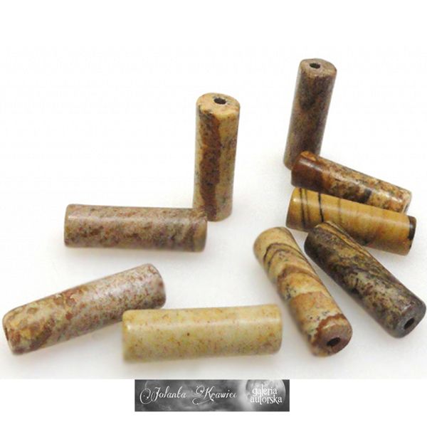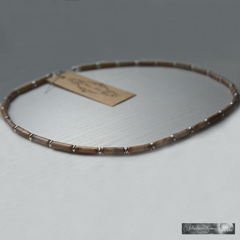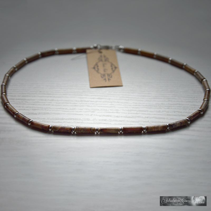 Naszyjnik męski wykonany z Jaspisu Obrazkowego naturalnego, wałeczków 13 mm x 4 mm, poprzeplatanych oponkami ze srebra 925. Długość około 48 cm. Naszyjnik wykonany na mocnym nośniku z linki jubilerskiej japońskiej. Wykończenie całościowe ze srebra 925.