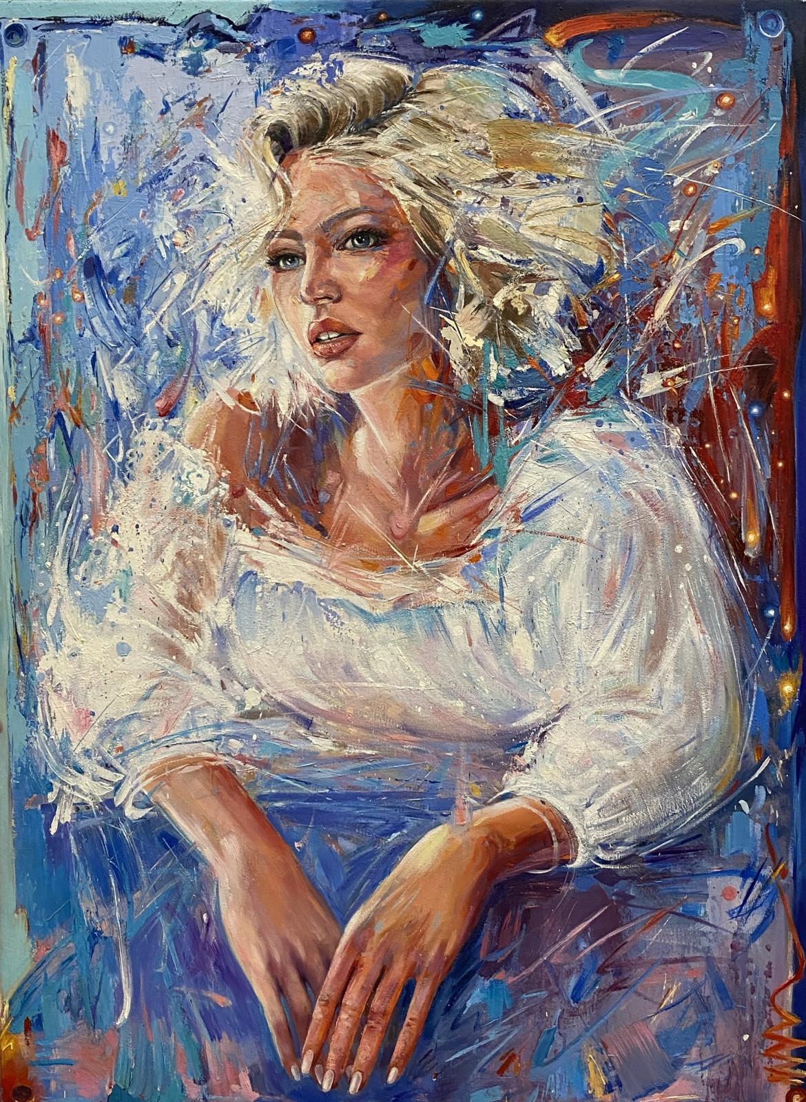 Tło obrazu oraz postać kobiety zbudowane są z bogatej faktury — warstwy farby układają się w wyraziste pociągnięcia pędzla, które nadają powierzchni głębi i ruchu. Kolorystyka jest intensywna, lecz harmonijna: przeplatają się tu odcienie czerwieni z chłodniejszymi błękitami, tworząc atmosferę pełną emocji i subtelnej tajemnicy.