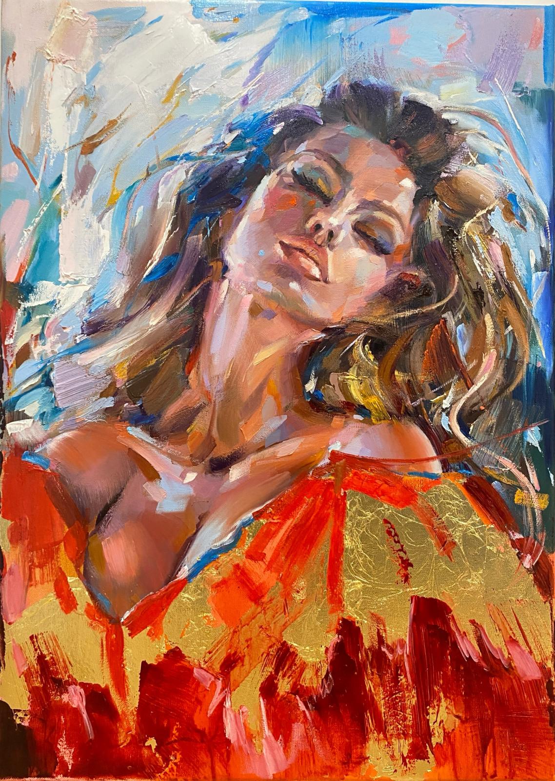 • Obraz malowany farbami olejnymi na płótnie bawełnianym o wymiarze 70×50cm, z dodatkiem złota, rok wykonania 2025
