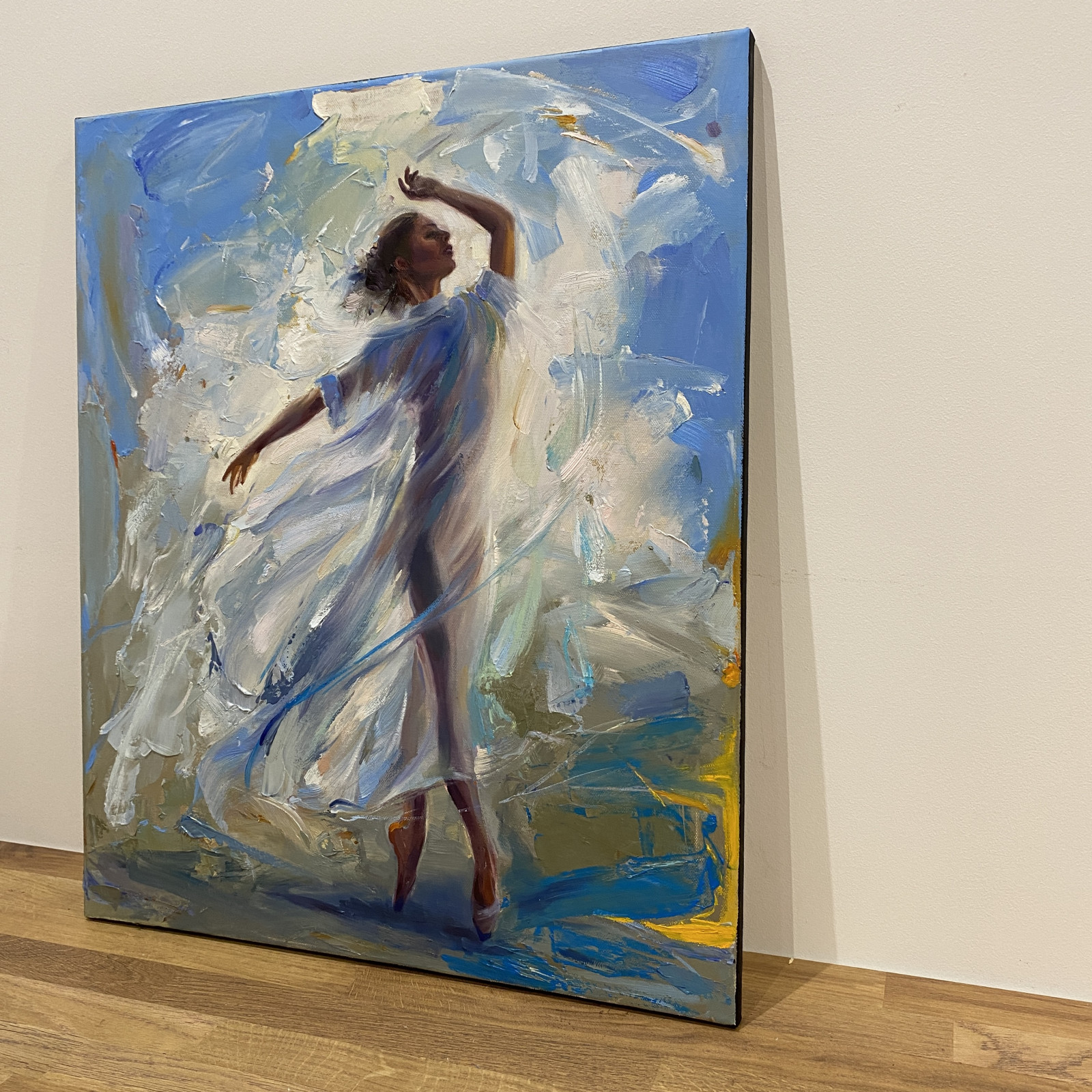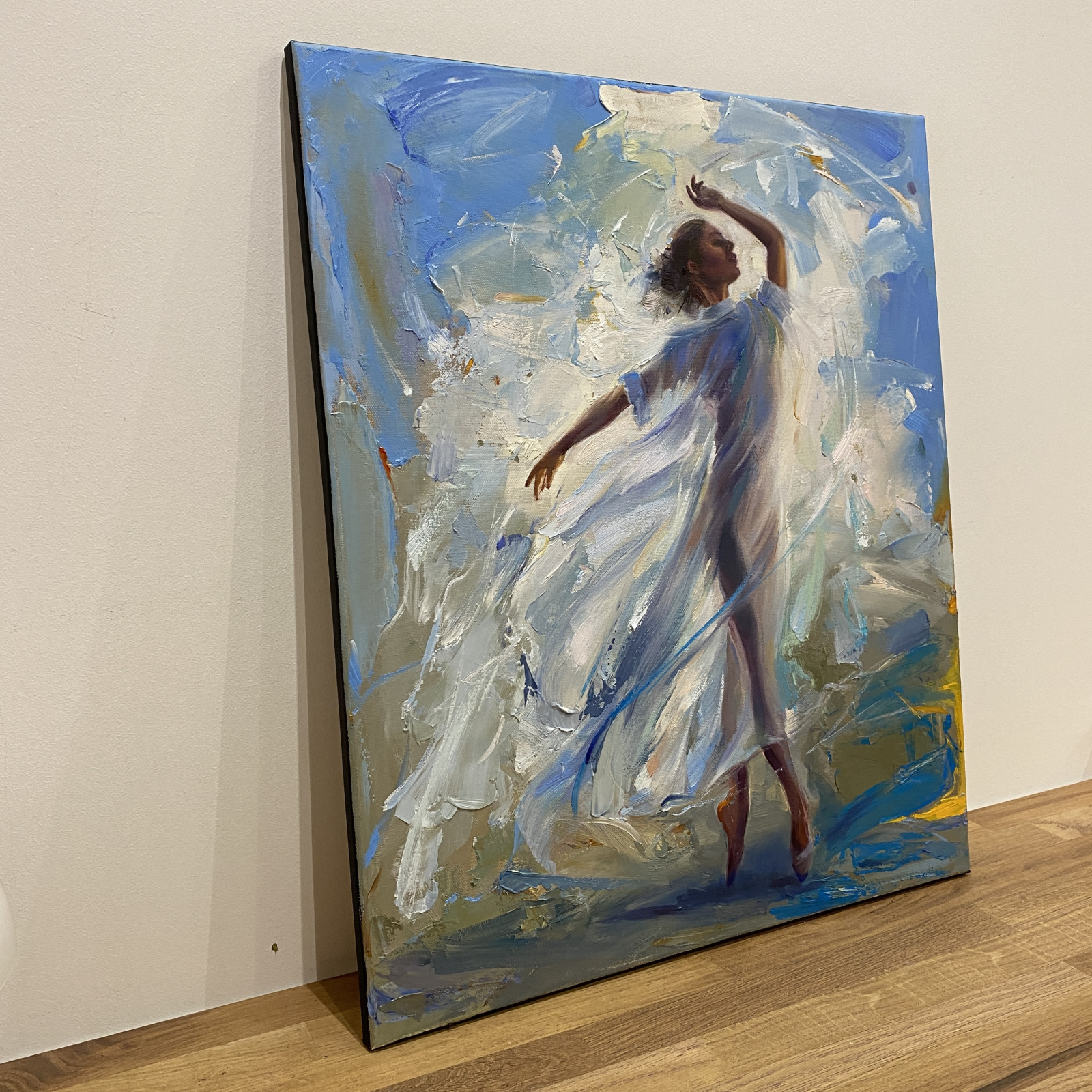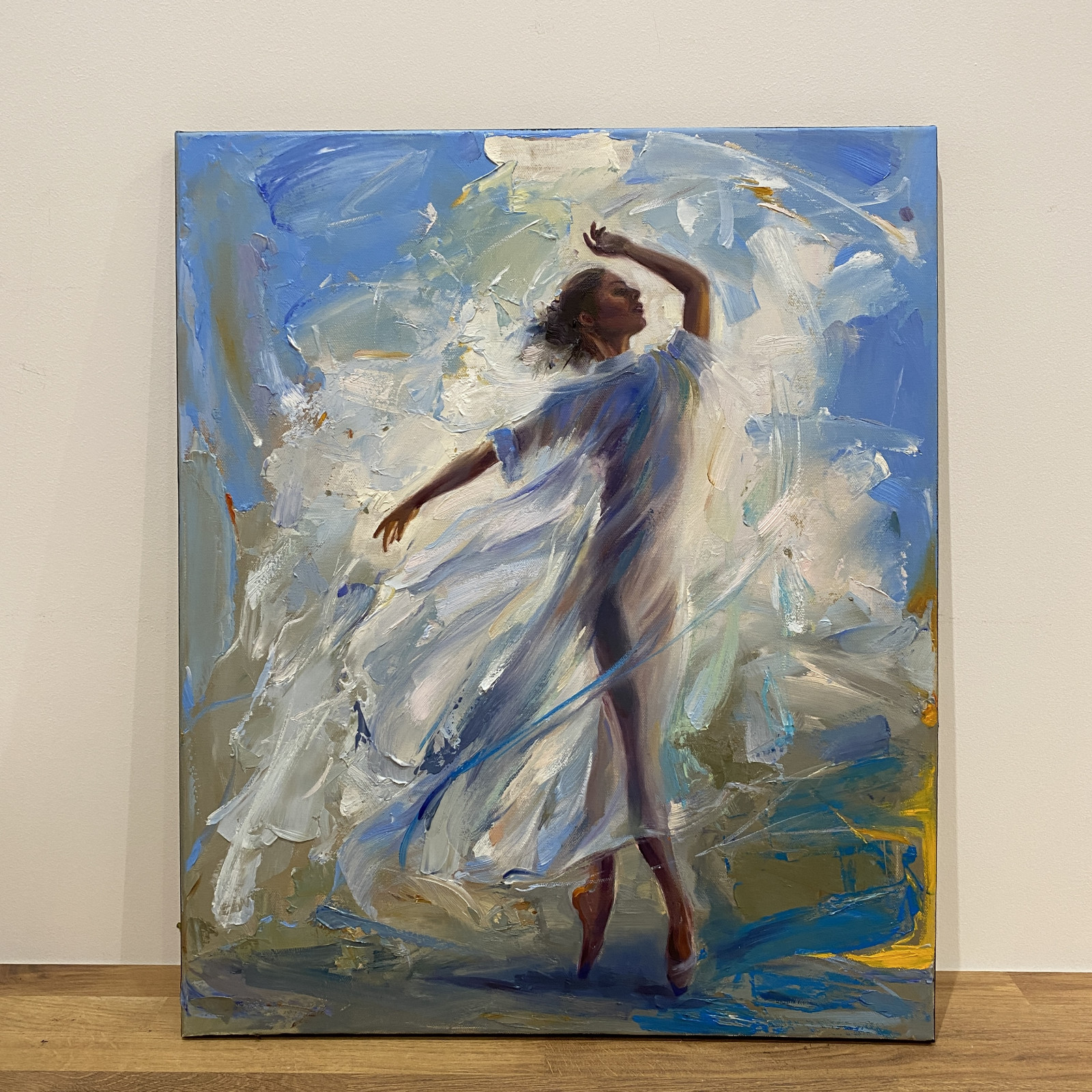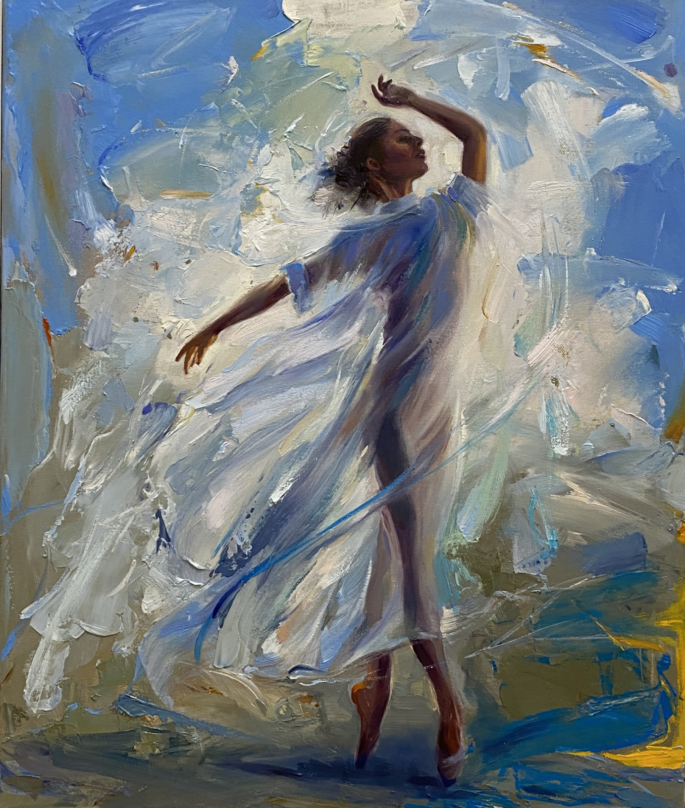Obraz przedstawia kobietę ujętą w ruchu, jakby właśnie porwał ją lekki, ciepły wiatr. Ma na sobie zwiewną, długą suknię, której materiał unosi się i faluje, tworząc miękkie, płynne linie. Suknia wydaje się lekka jak mgła — w pastelowym odcieniu, który podkreśla delikatność sceny.