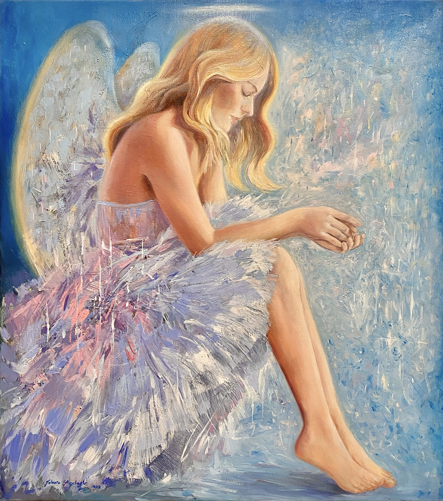 Na obrazie przedstawiona jest kobieta-anioł siedząca bokiem do widza. Jej sylwetka jest delikatna, a skrzydła miękko rozpościerają się za plecami, jakby uchwycone w spokojnym bezruchu. Głowę ma lekko opuszczoną w dół, co nadaje jej wyraz zamyślenia i cichego zatroskania.