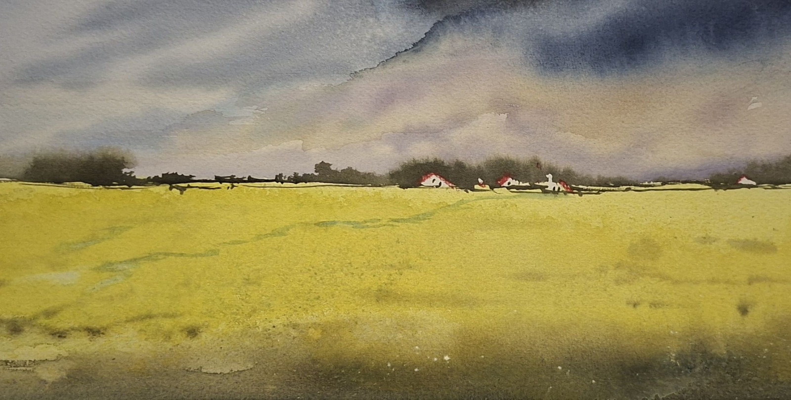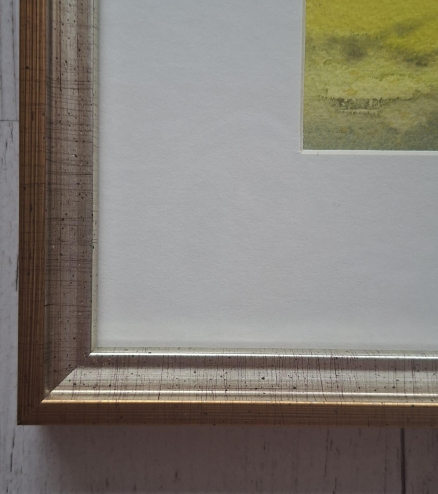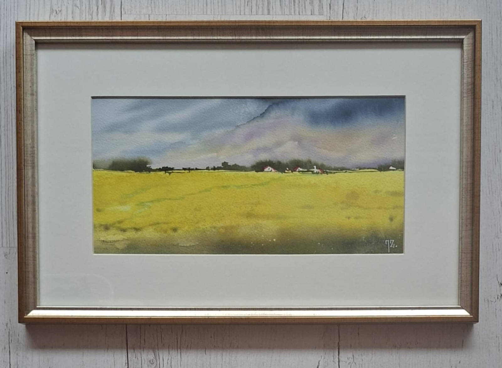 Panoramiczna akwarela w formacie 15x30 przedstawia pejzaż z polem kwitnącego rzepaku. Została namalowana na włoskim papierze wysokiej jakości, o 100% zawartości bawełny i gramaturze 300g/m2. Praca jest profesjonalnie oprawiona w pass-partout (złamana biel) i piękną ramę w kolorze starego złota. Wymiary zewnętrzne ramy: 28x43 cm. Akwarela jest gotowa do powieszenia, idealna na prezent.