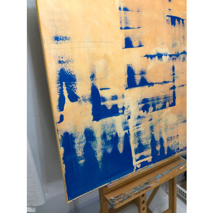 Ten obraz to prawdziwa eksplozja kolorów, której nie da się przegapić. Dominują tu intensywne odcienie niebieskiego, które kontrastują z ciepłymi beżami, tworząc kompozycję pełną dynamiki. Kształty na płótnie przypominają nieregularne plamy i smugi, jakby artysta zanurzył się w emocjach i próbował je uchwycić pędzlem. Całość jest trochę jak niezaplanowany taniec kolorów.