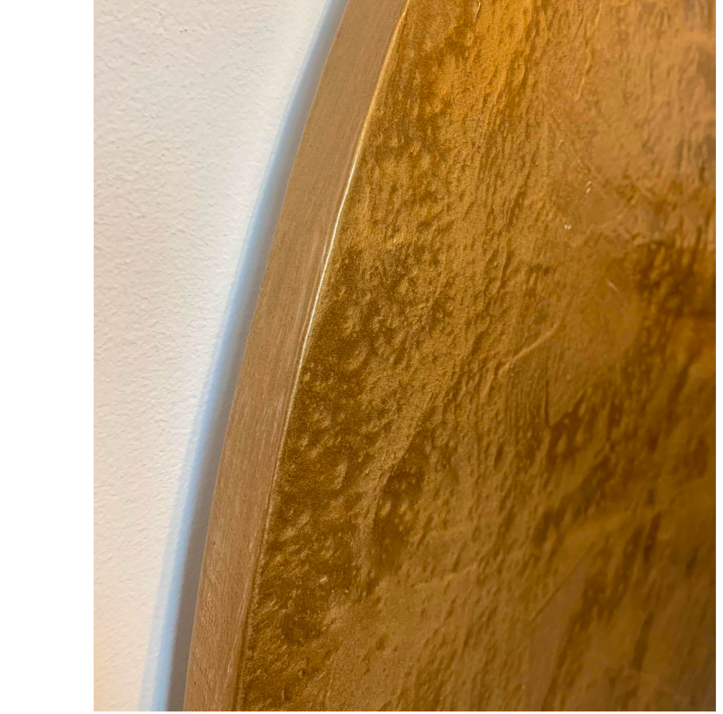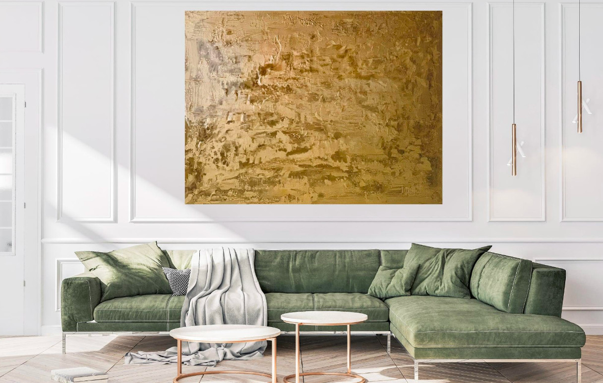 Inspiracją powstania złotej serii obrazów był król Midas, który wszystko ozłacał. Praca jest nawiązaniem do tej legendy, ponieważ pokrycie przedmiotów metaliczną powłoką daje niemal bajkowy efekt. Abstrakcyjny złoty obraz, wykonany techniką własną mieszaną, obraz nie wymaga ramy, boczne krawędzie płótna zamalowane. Obraz posiada dodatkową fakturę uzyskaną szpachlą. Praca zawerniksowana błyszczącym lakierem. Obraz sygnowany z tyłu. Zastosowanie złota w dodatkach do wnętrz potrafi w wyrafinowany sposób je upiększyć.
