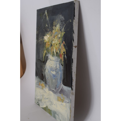 Obraz olejny na płótnie o wymiarach 30x40 cm. Przedstawia ekspresyjne kwiaty w wazonie. Barwy są nasycone. Mocno kontrastowy. Ma widoczną fakturkę poprzez dużą ilośc użytych farb. Idealny do ożywienia wnętrza pomieszczenia lub jako prezent dla bliskich. Po więcej informacji zapraszam serdecznie do wiadomości prywatnej )