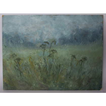 Przedstawia pejzaż - mglistą łąkę z kontrastowym horyzontem. Obraz jest wielobarwny w chłodnej gamie kolorów. Po więcej informacji zapraszam serdecznie do wiadomości prywatnej :)