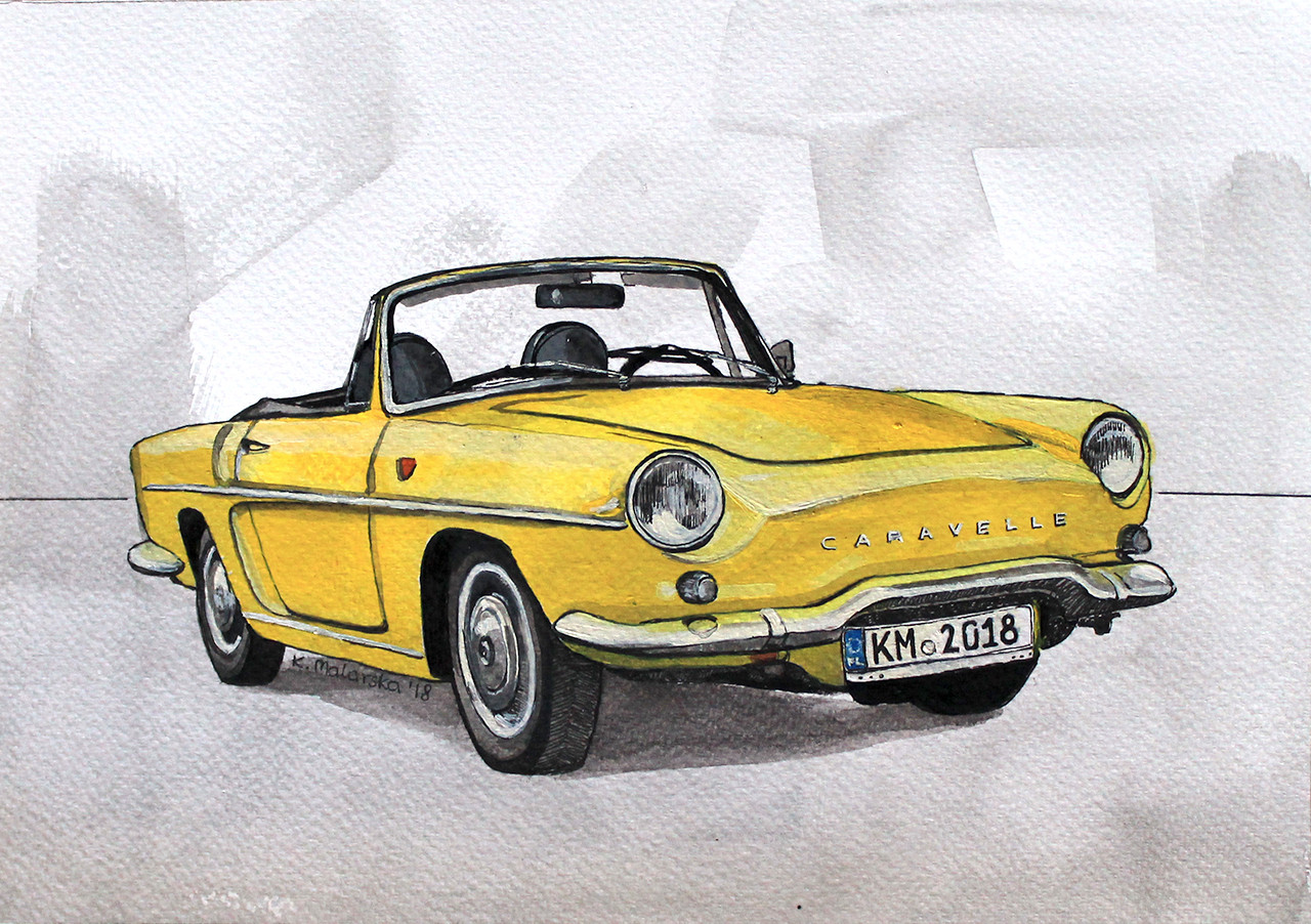 Renault Caravelle - grafika wykonana techniką mieszaną na papierze (widoczna lekka faktura papieru).