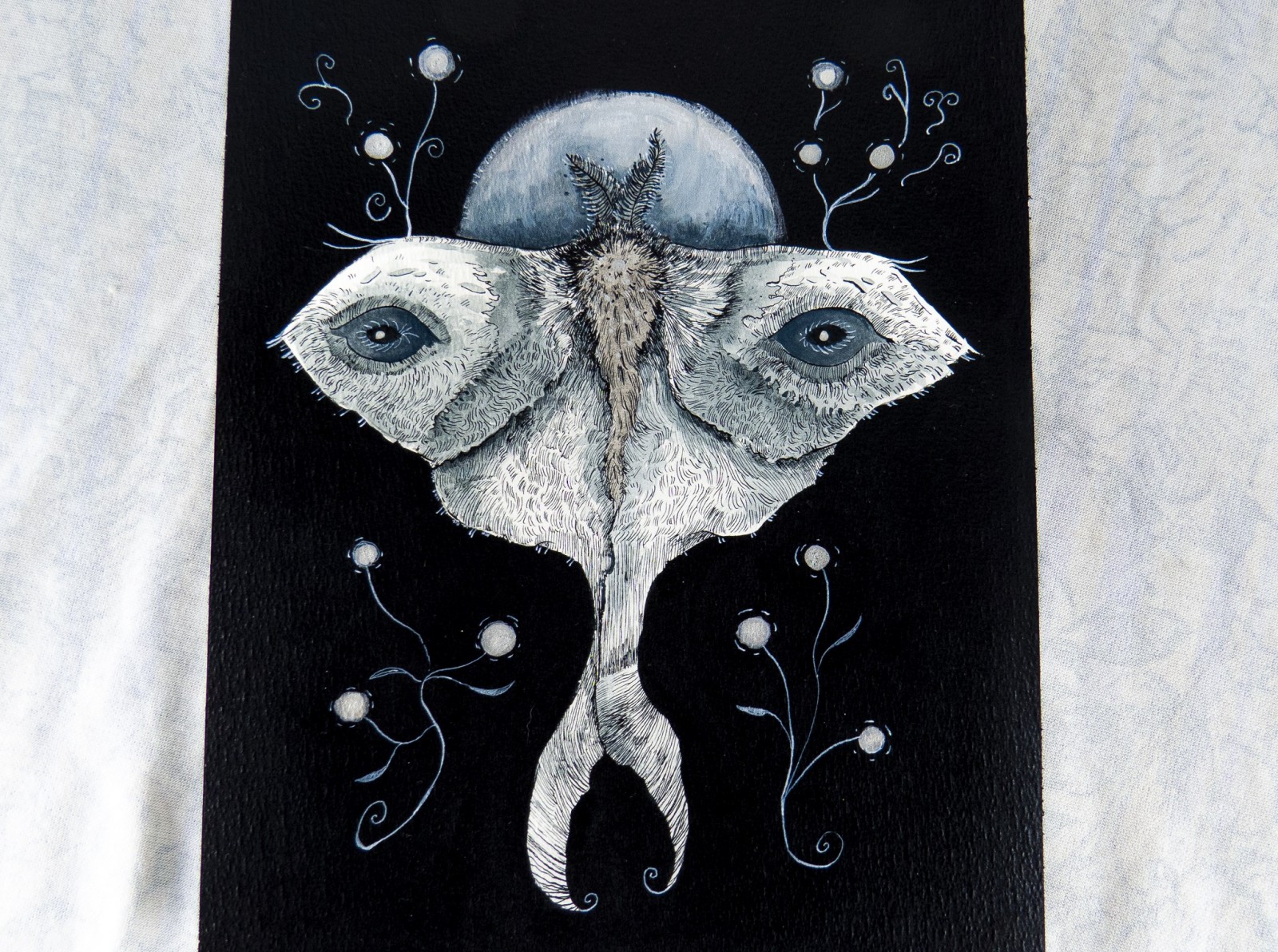 Obraz został wykonany tuszem akrylowym na wysokiej jakości bezkwasowym, bawełnianym papierze Fontaine. Dzięki domieszce srebrnego tuszu ślicznie się błyszczy, trudno to jednak uchwycić na zdjęciach.