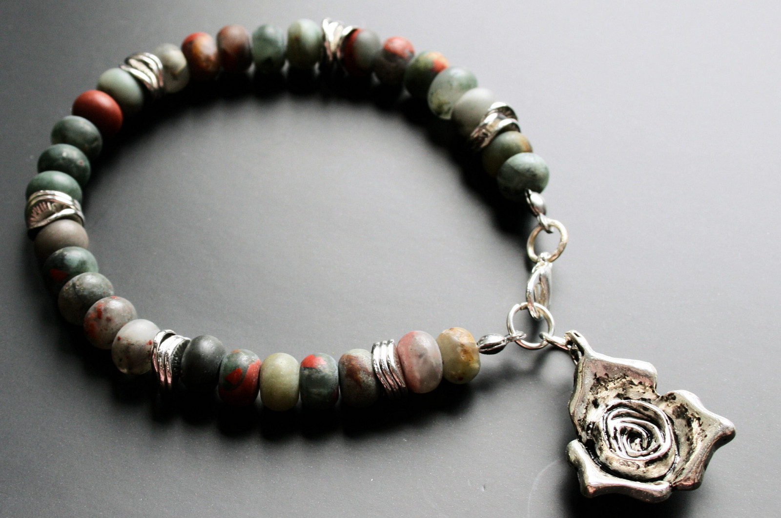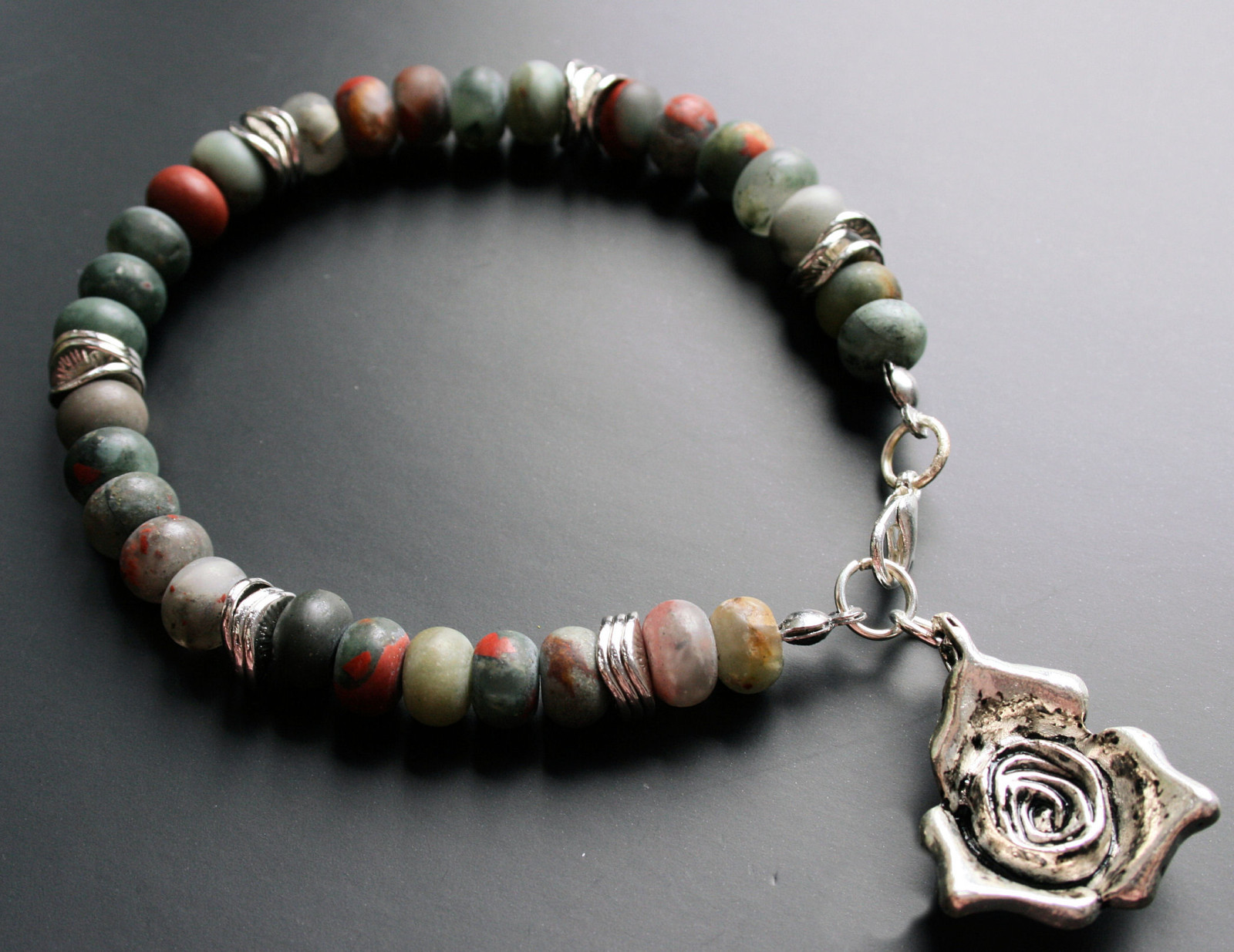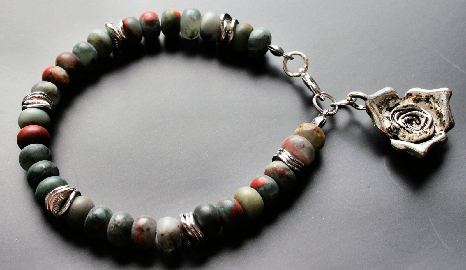 Bransoletka wykonana z jaspisu krwisty i stalowych elementów w kolorze srebrnym