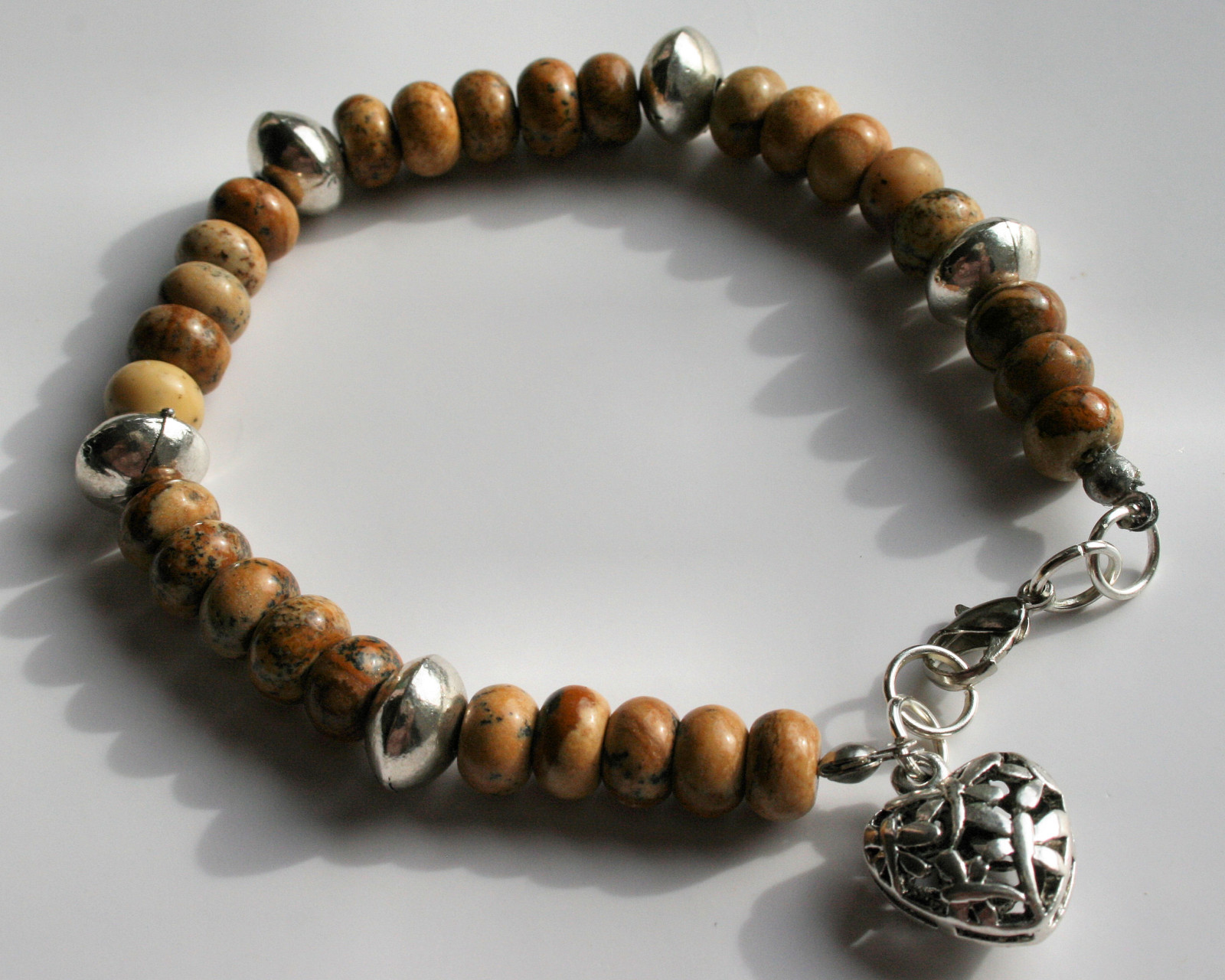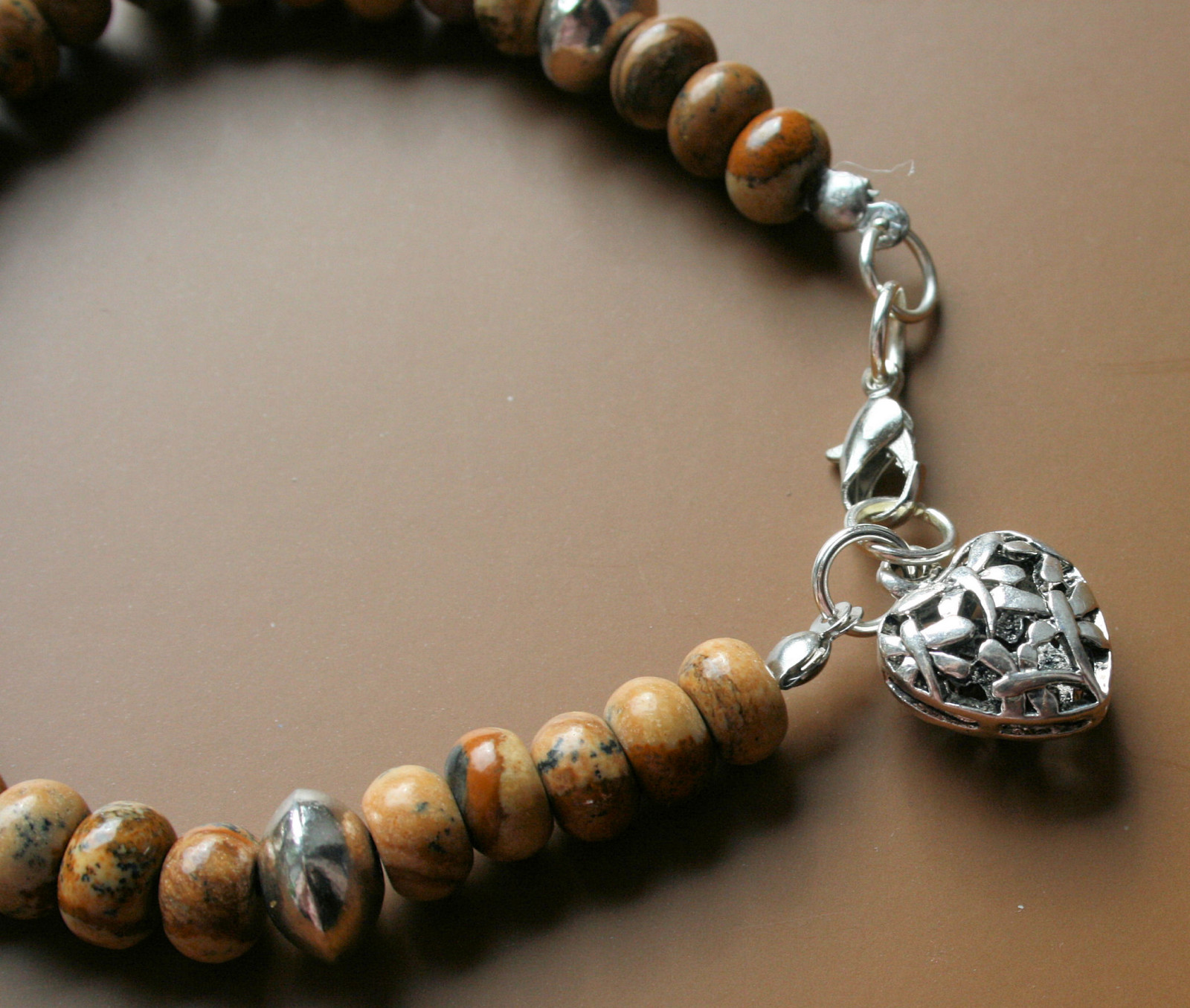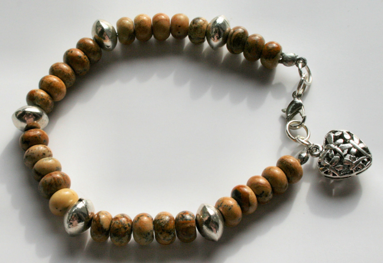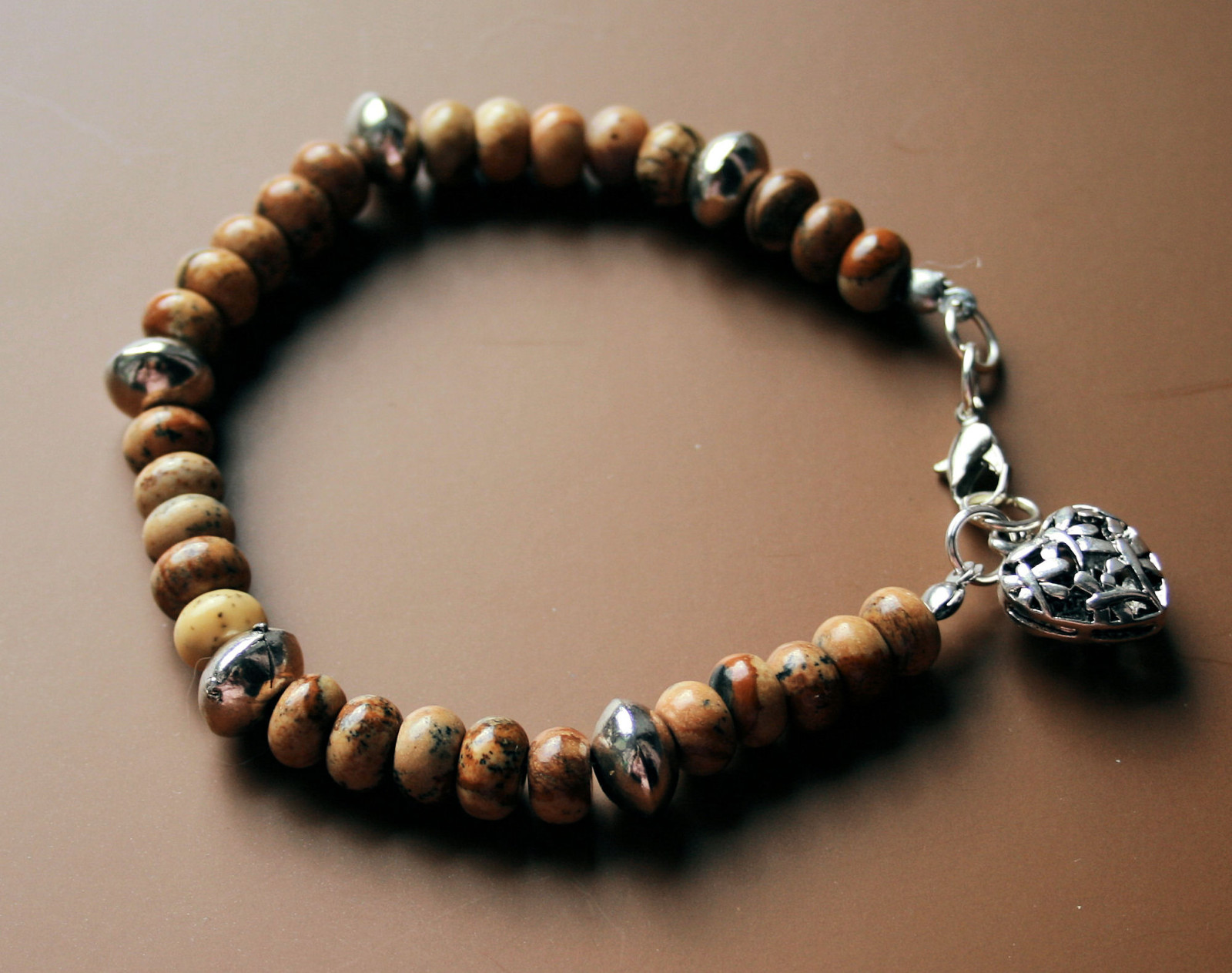 Bransoletka wykonana z jaspisu piaskowego i metalowych koralików w kolorze srebrnym.
