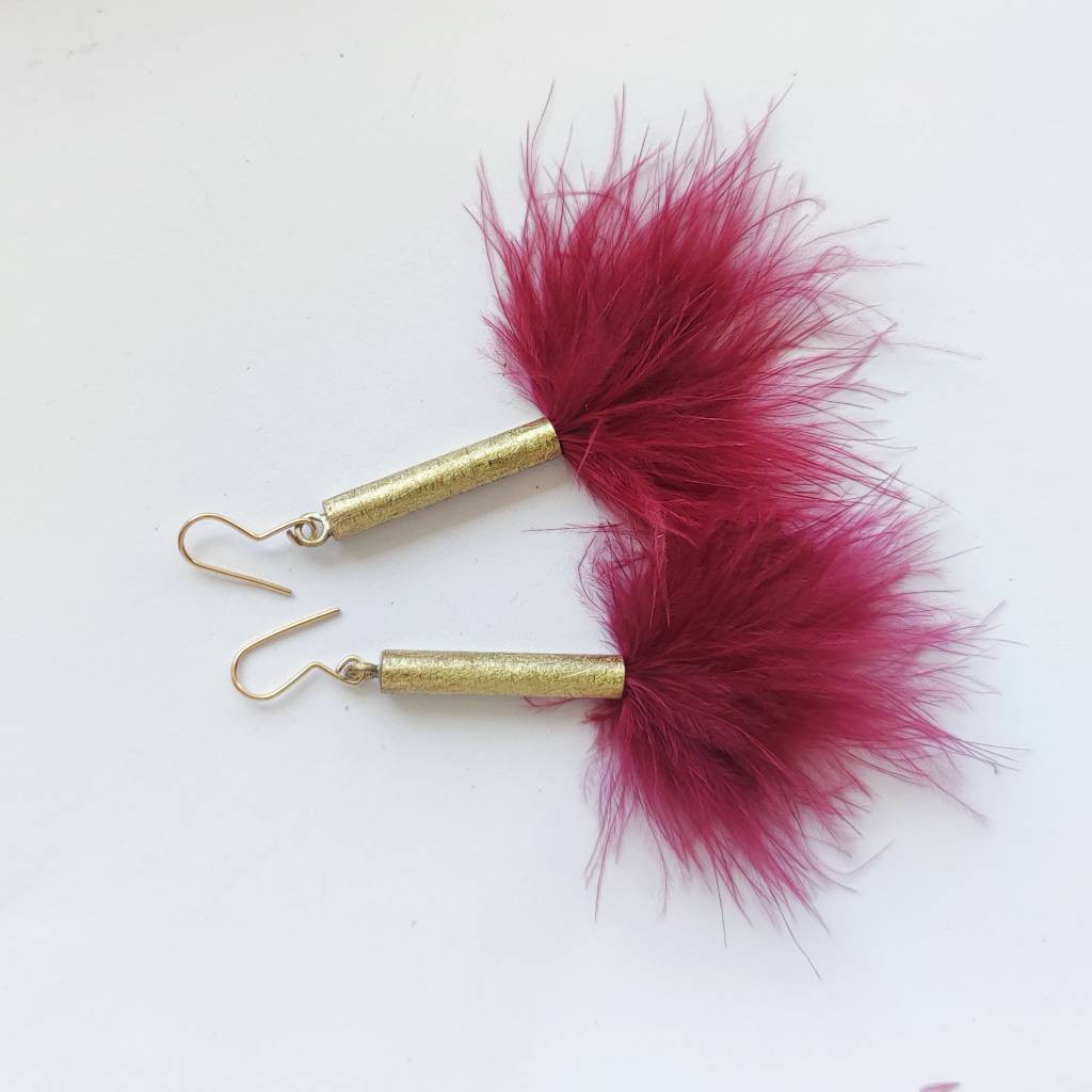 PIÓRKO ? stylowy dodatek. Połączenie lekkości piórka i trwałości metalu. Metal niezwykle kontrastuje z naturalnym barwionym puchem. Kolczyki wykonane są z mosiądz, naturalnie barwione pióra. Mosiądz zmatowiony Bigle otwarte srebro pr.925,pozłacane. Długość z biglami ok. 7cm.