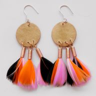 PIÓRKO - stylowy dodatek. Połączenie lekkości piórka i trwałości metalu. Metal niezwykle kontrastuje z naturalnym barwionym puchem. Kolczyki wykonane są z mosiądzu, naturalnie barwione pióra. Mosiądz - polerowany, zmatowiony. Bigle otwarte - srebro pr.925,pozłacane. Długość z biglami - 5 cm. Szerokość - ok. 6 cm. Waga - ok. 2,4 g.