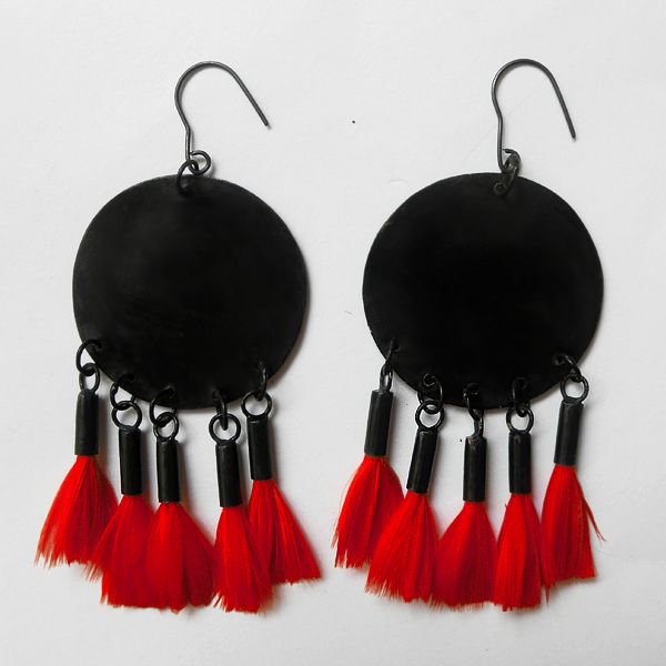 PIÓRKO - stylowy dodatek. Połączenie lekkości piórka i trwałości metalu. Metal niezwykle kontrastuje z naturalnym barwionym puchem. Kolczyki wykonane są z : mosiądz, naturalne barwione pióra. Mosiądz : zmatowiony, oksydowany. Bigle otwarte - srebro pr.925,oksydowane. Długość z biglami - 10 cm. Szerokość - 4,7 cm