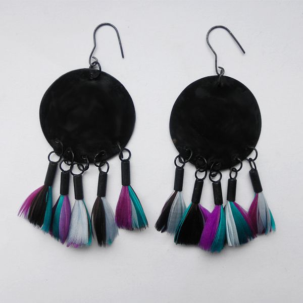 PIÓRKO - stylowy dodatek. Połączenie lekkości piórka i trwałości metalu. Metal niezwykle kontrastuje z naturalnym barwionym puchem. Kolczyki wykonane są z : mosiądz, naturalne barwione pióra. Mosiądz : zmatowiony, oksydowany. Bigle otwarte - srebro pr.925,oksydowane. Długość z biglami - 10 cm. Szerokość - 4,7 cm