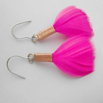 PIÓRKO - stylowy dodatek. Połączenie lekkości piórka i trwałości metalu. Metal niezwykle kontrastuje z naturalnym barwionym puchem. Kolczyki wykonane są z miedzi, naturalnie barwione pióra. Miedź - zmatowiony. Bigle otwarte - srebro pr.925. Długość z biglami - 7,5 cm. Szerokość - 3 cm. Waga - ok. 2,5 g.