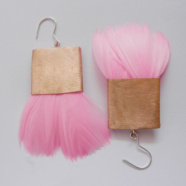 PIÓRKO - stylowy dodatek. Połączenie lekkości piórka i trwałości metalu. Metal niezwykle kontrastuje z naturalnym barwionym puchem. Kolczyki wykonane są z brązu, naturalnie barwione pióra. Brąz - zmatowiony. Bigle otwarte - srebro pr.925. Długość z biglami - 8 cm. Szerokość - 5 cm.