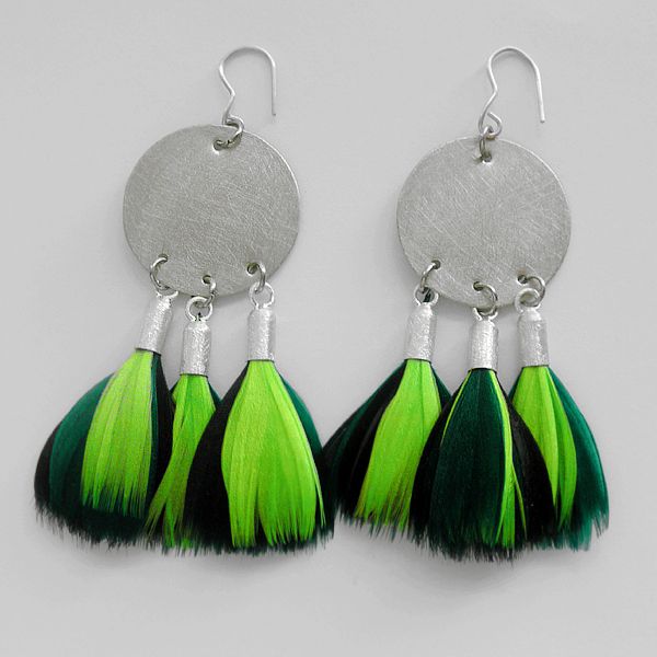 ałości metalu. Metal niezwykle kontrastuje z naturalnym barwionym puchem. Kolczyki wykonane są z srebro, alpaka. naturalnie barwione pióra. Srebro, alpaka - zmatowiony. Bigle otwarte - srebro pr.925. Długość z biglami - 10 cm. Szerokość - 5 cm.