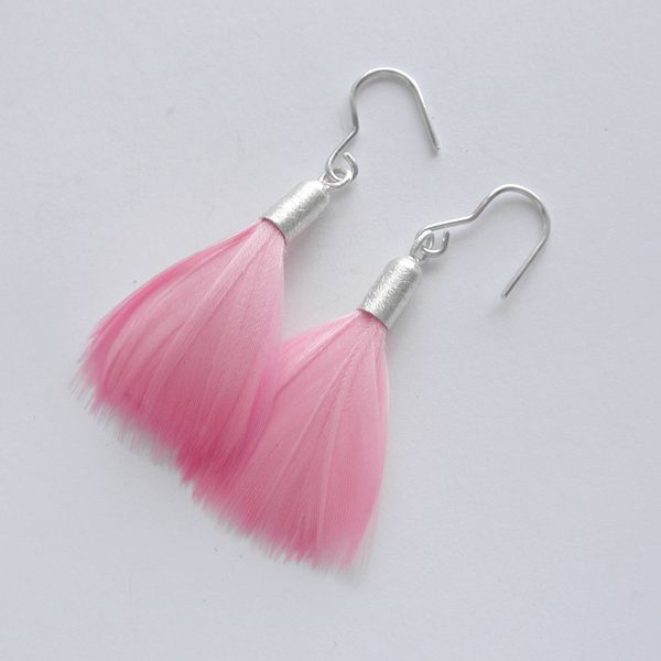 PIÓRKO - stylowy dodatek. Połączenie lekkości piórka i trwałości metalu. Metal niezwykle kontrastuje z naturalnym barwionym puchem. Kolczyki wykonane są z srebro, naturalnie barwione pióra. Srebro - zmatowione. Bigle otwarte - srebro pr.925. Długość z biglami - 5,5 cm.
