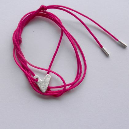 Wisiorek wykonany jest z, ze srebra. Srebro - próby 0,925, zmatowione, ozdobny sznurek. Srebro - zmatowione. Długość zawieszki - ok. 1 cm. Szerokość zawieszki - ok. 1 cm. Długość sznurka ok. 60 cm. Istnieje możliwość wykonania wisiorka o innym kolorze sznurka