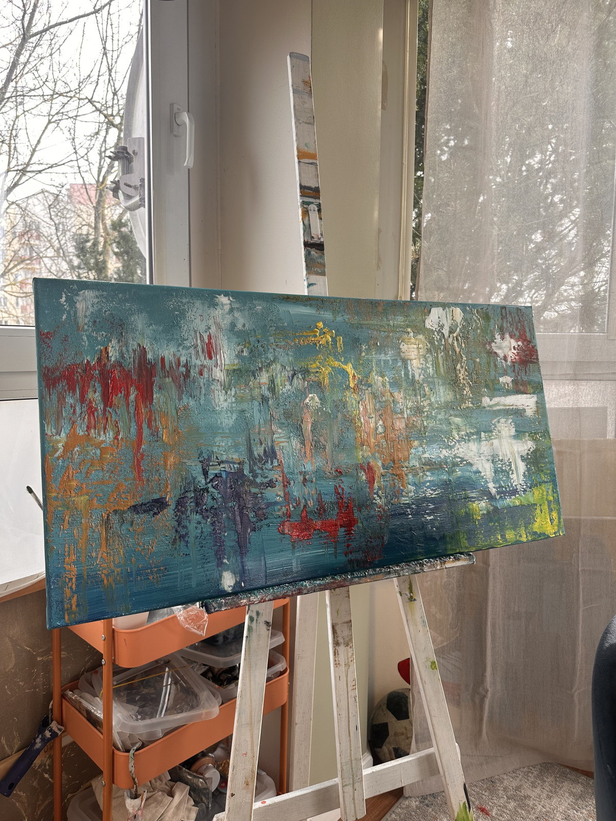 Kompozycja przypomina pejzaż wodny lub odbicia światła na powierzchni wody, jednak pozostaje otwarta na interpretację. W niektórych miejscach kolory zdają się dryfować i rozmywać, co nadaje całości wrażenie tajemniczości i emocjonalnego napięcia. Obraz może budzić skojarzenia z naturą, burzą lub abstrakcyjnymi wspomnieniami i emocjami.