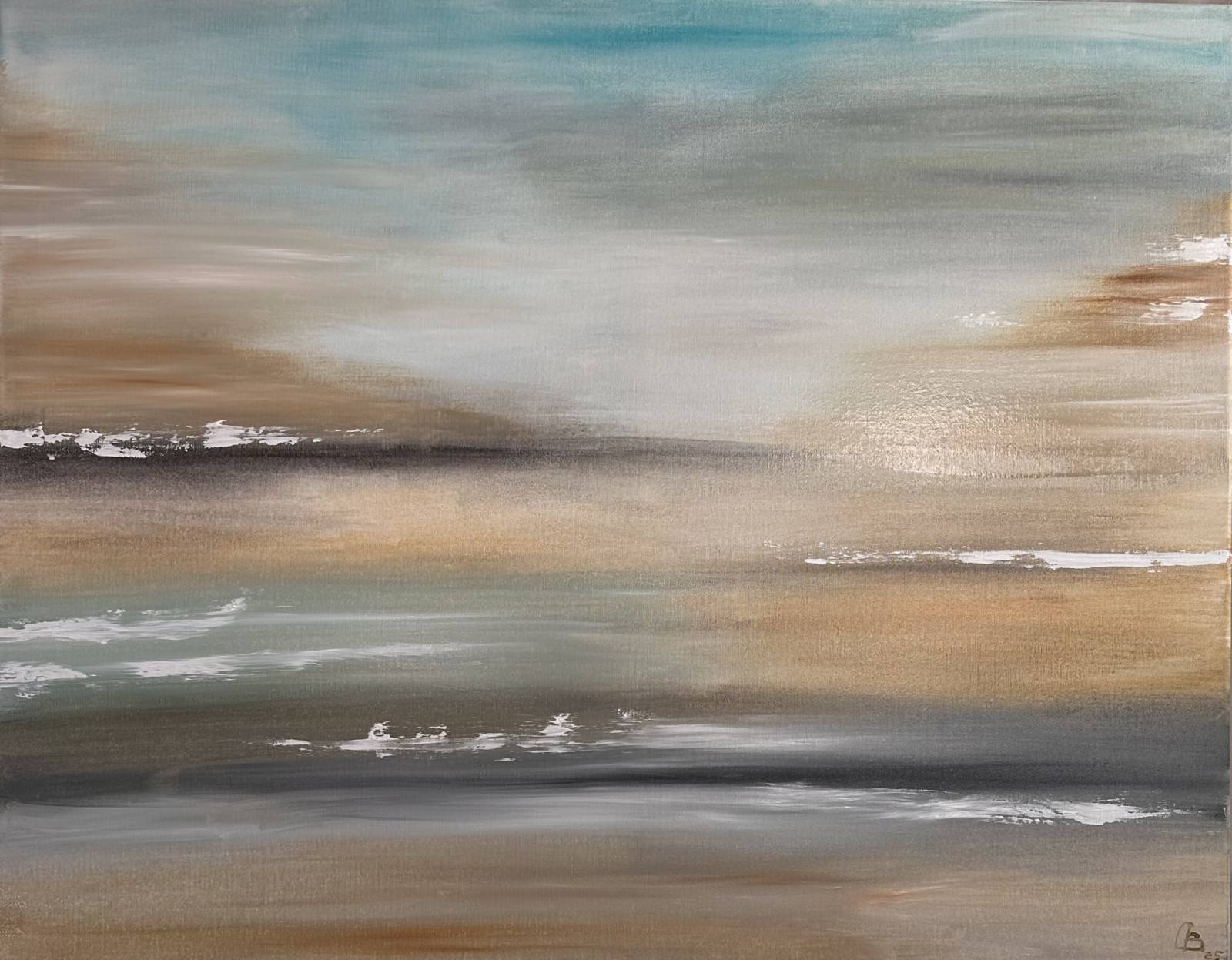 Kompozycja przypomina pejzaż – być może mglisty horyzont, pustynną przestrzeń lub spokojne wybrzeże. Białe akcenty sugerują refleksy światła na wodzie lub ślady fal na piasku. Struktura obrazu jest subtelna, a pociągnięcia pędzla tworzą efekt płynności i głębi.