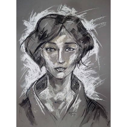 Rysunek wykonany pastelami suchymi, węglem i srebrnym tuszem na brystolu 50x70 cm, zabezpieczony fiksatywą, bez ramy. Do tego ciut srebrnej kredki. Na życzenie tworzę symulację kolorystyczną passe partout pasującego do rysunku. Kolory mogą nieznacznie odbiegać od oryginału w zależności od ustawień monitora. Pracę wysyłam w tubie przesyłką priorytetową.