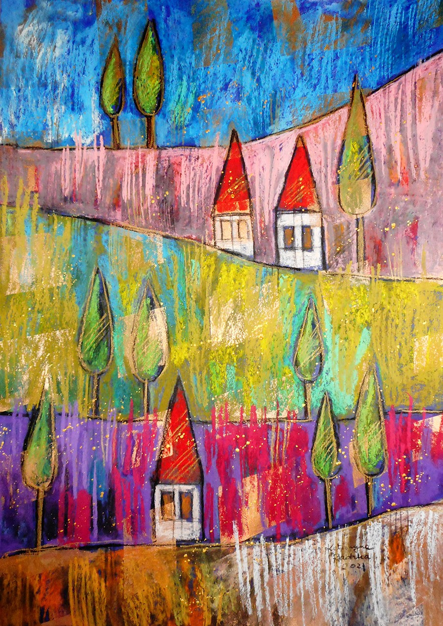rysunek wykonany pastelami, akrylami, ecoliną i węglem na brystolu 50x70 cm, zabezpieczony fiksatywą, nieoprawiony. Nieco złotej kredki. Na życzenie tworzę symulację kolorystyczną passe partout pasującego do rysunku. Kolory mogą nieznacznie odbiegać od oryginału w zależności od ustawień monitora. Pracę wysyłam w tubie przesyłką priorytetową.