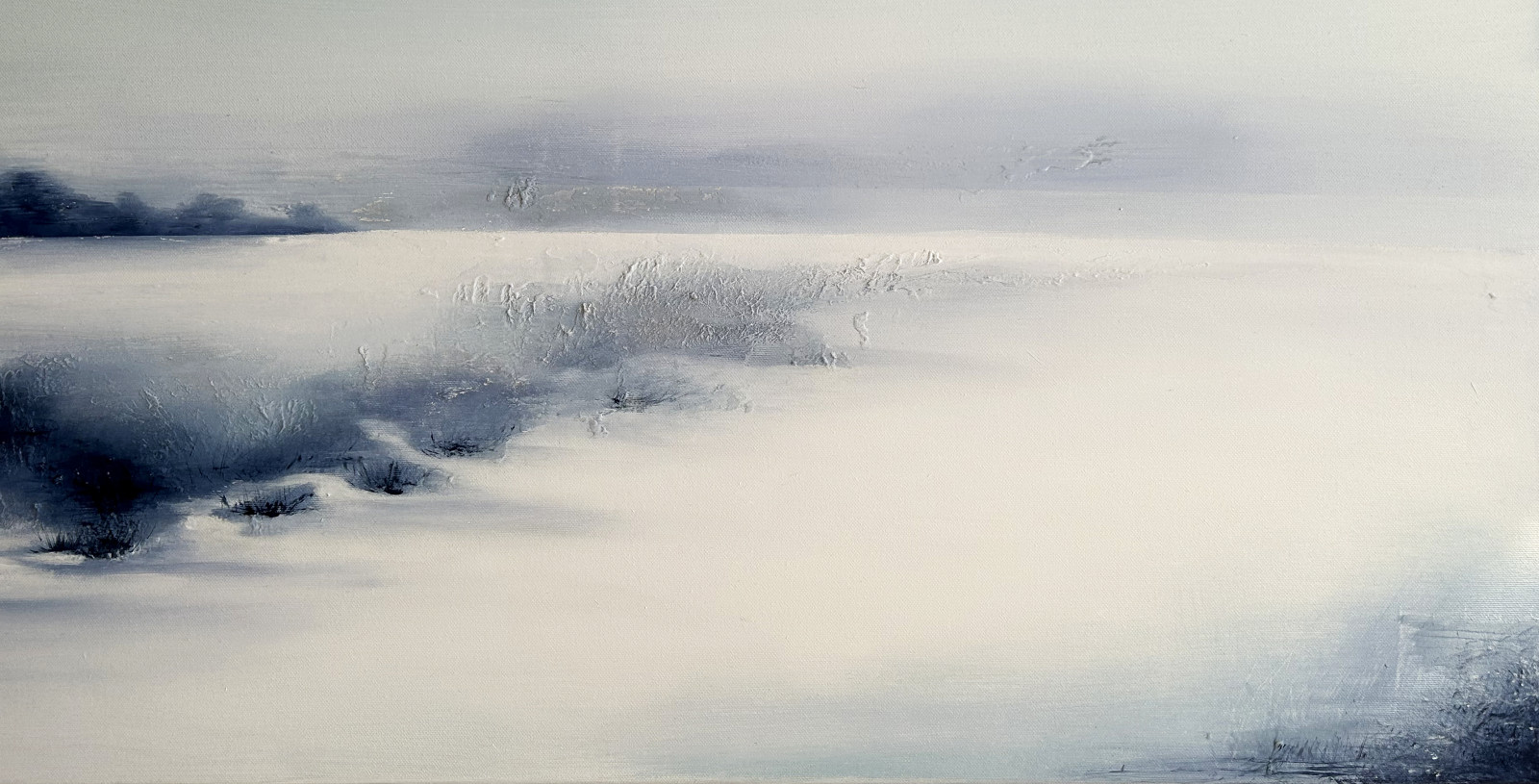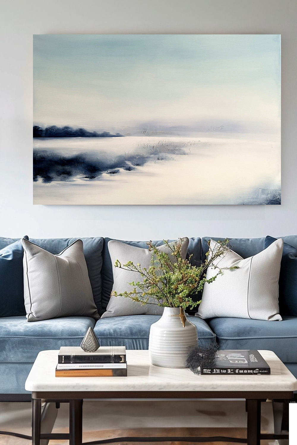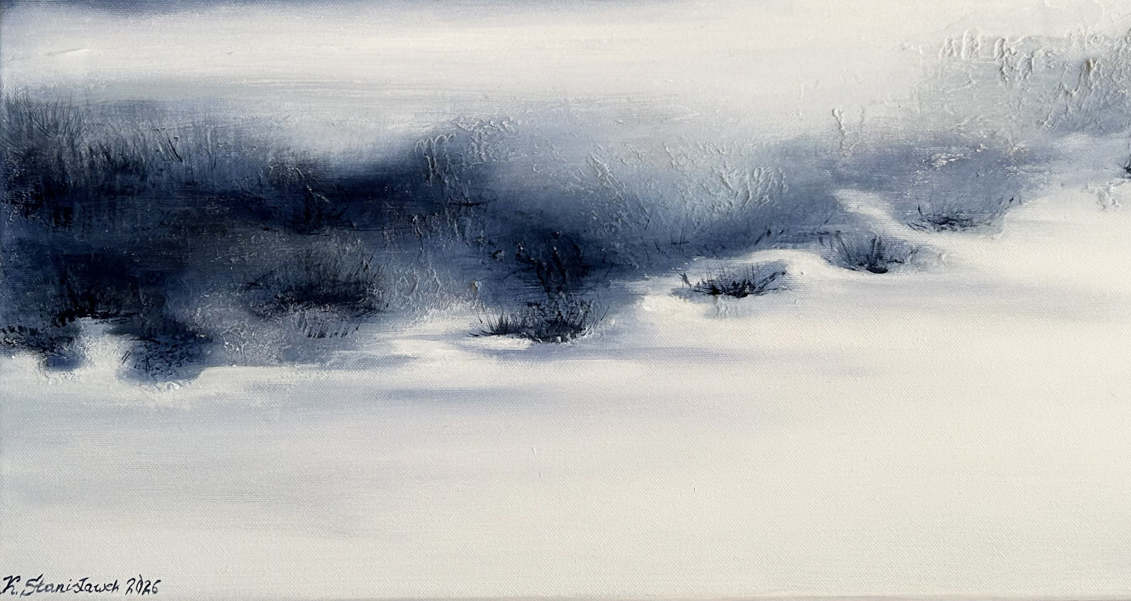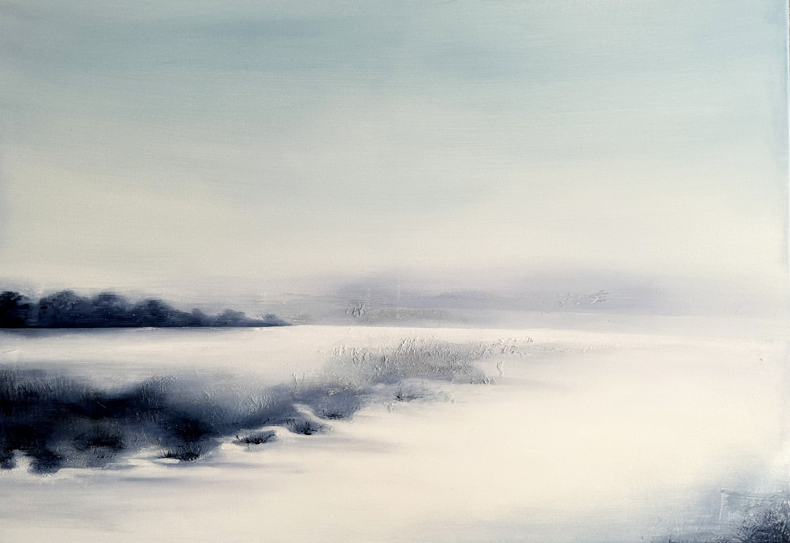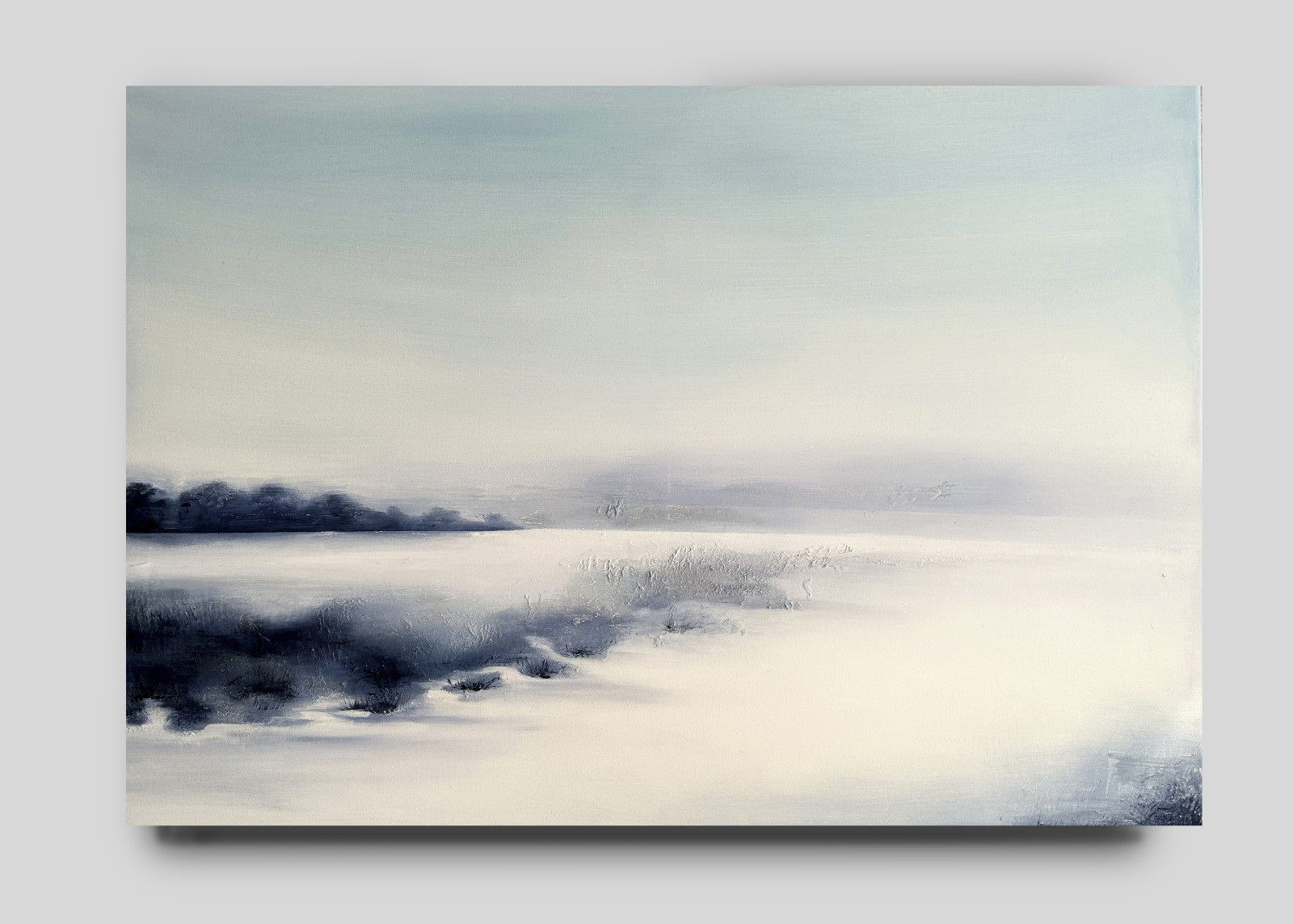 Obraz przedstawia minimalistyczny, zimowy pejzaż utrzymany w chłodnej, stonowanej palecie bieli i i błękitów. Rozległa, niemal pusta przestrzeń śnieżnej równiny przenika się z delikatnie zaznaczonym horyzontem i mglistym niebem, co buduje wrażenie ciszy i bezkresu. Subtelna faktura farby akrylowej dodaje powierzchni głębi i miękkiego rytmu, przypominając ślady wiatru na śniegu. Całość emanuje spokojem, kontemplacją i chłodną, zimową melancholią.