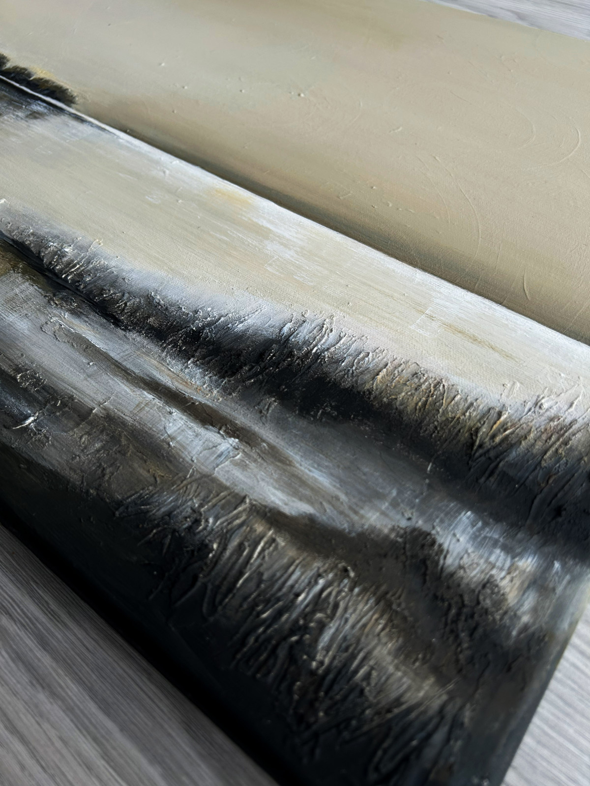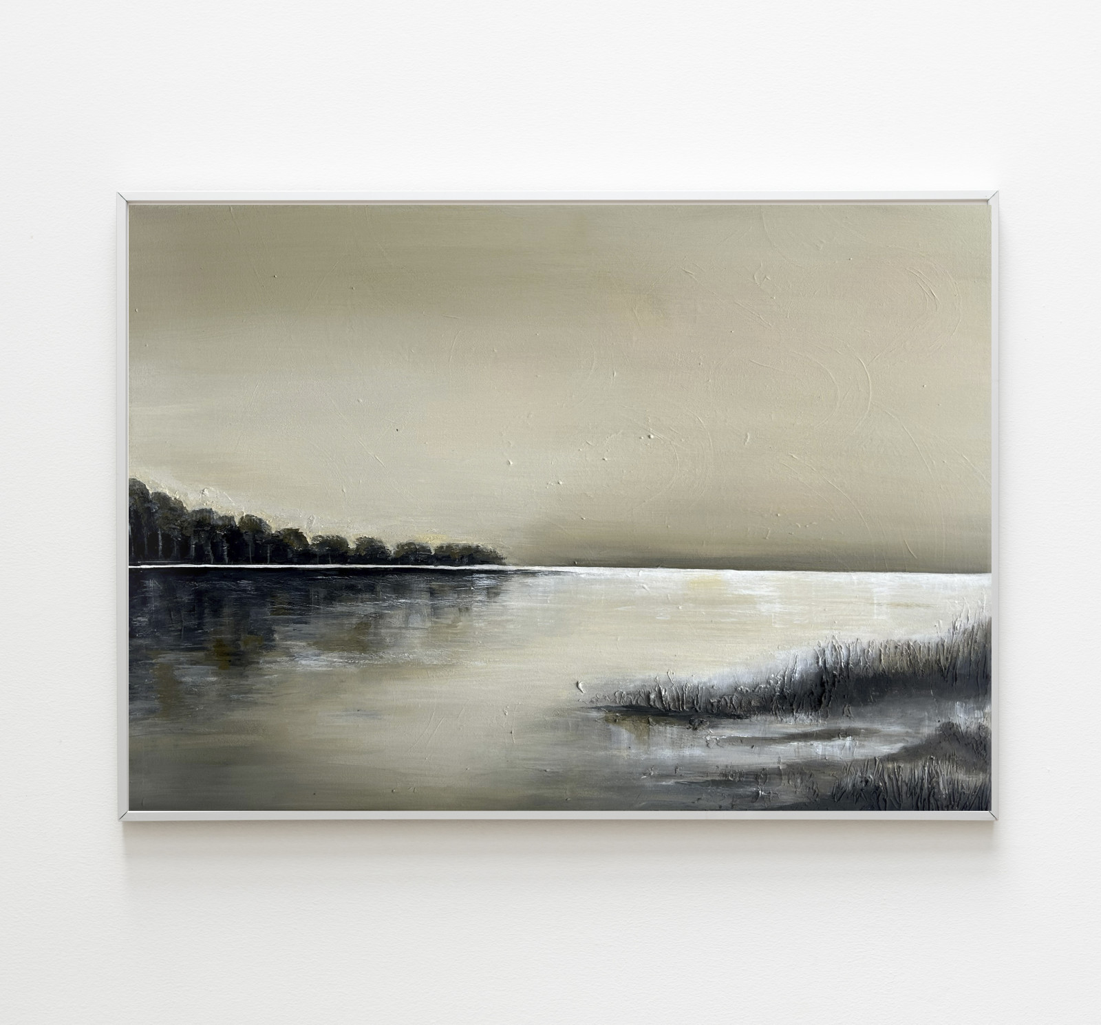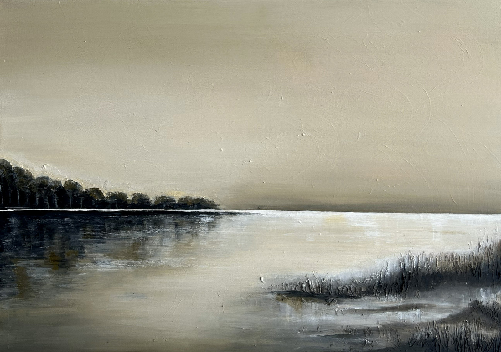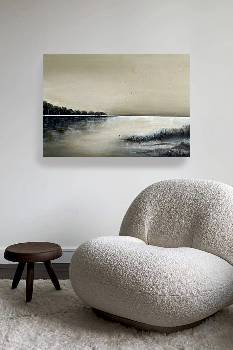 Abstrakcyjny pejzaż w stonowanej palecie barw, utrzymany w odcieniach beżu, szarości i głębokich grafitów. Kompozycja przywołuje spokojny krajobraz nad wodą – linię horyzontu, odbicia na tafli oraz delikatnie zarysowaną roślinność. Obraz emanuje ciszą i kontemplacją, pozostawiając widzowi przestrzeń do własnej interpretacji.