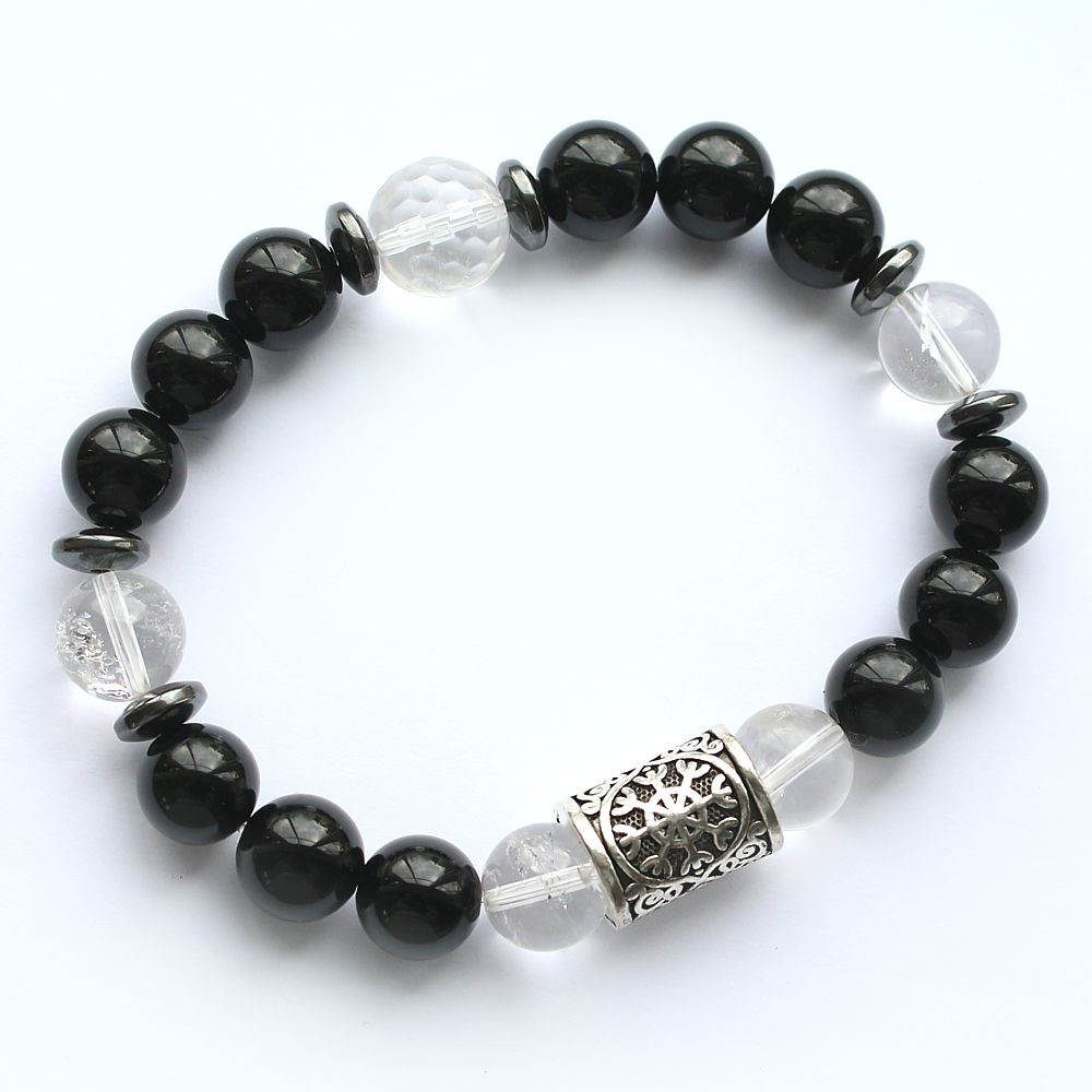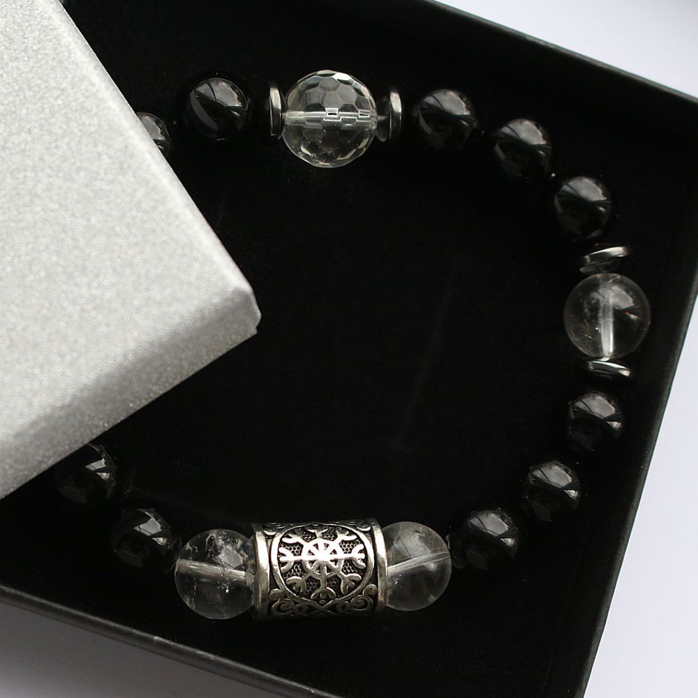 Energetyczna bransoletka ochronna z czarnym turmalinem, azeztulitem, kryształem górskim, hematytem i Tarczą algizową (AEGISHJALMUR). To starożytny potężny symbol ochronny odbijający negatywne wpływy fizyczne i duchowe. Uważany za jeden z najsilniejszych znaków ochronnych. Chętnie wybierany przez ludzi zawodowo pracujących z energią.