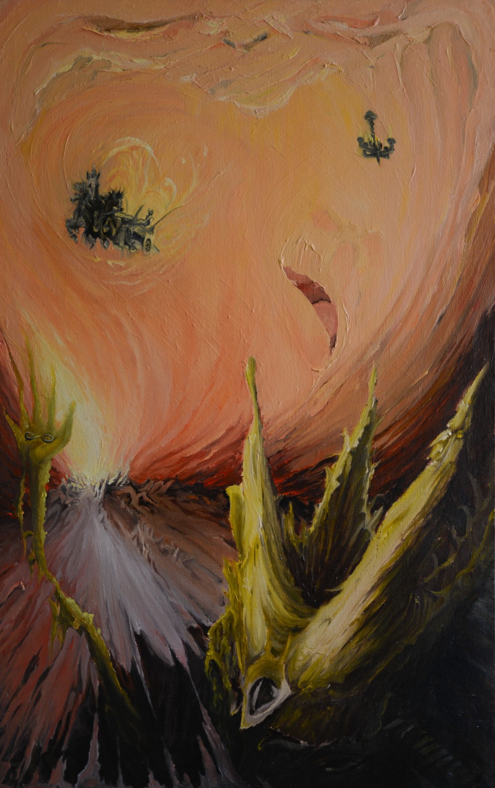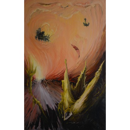 Obraz to ---Upadek Króla ----jest wykonany ok 2020 roku. Wymiary 67/104 .Wykonany został od podstaw w całości (deski,naciąganie płotna oraz mieszanka podkładu/podobrazia ,które nie pęka po zwinięciu w rulon. Zastosowany został werniks matowy aby nie kolidował z otoczeniem i lepiej reprezentował się na każdej ścianie w domu. Jeśli zajdzie potrzeba to boki mogę w mig zainpregnować w kolor głębokiej czerni. Obraz jest nieco strukturalny. Płótno ok40lat przechowywane w idealnych warunkach.Praca sygnowana z tyłu.