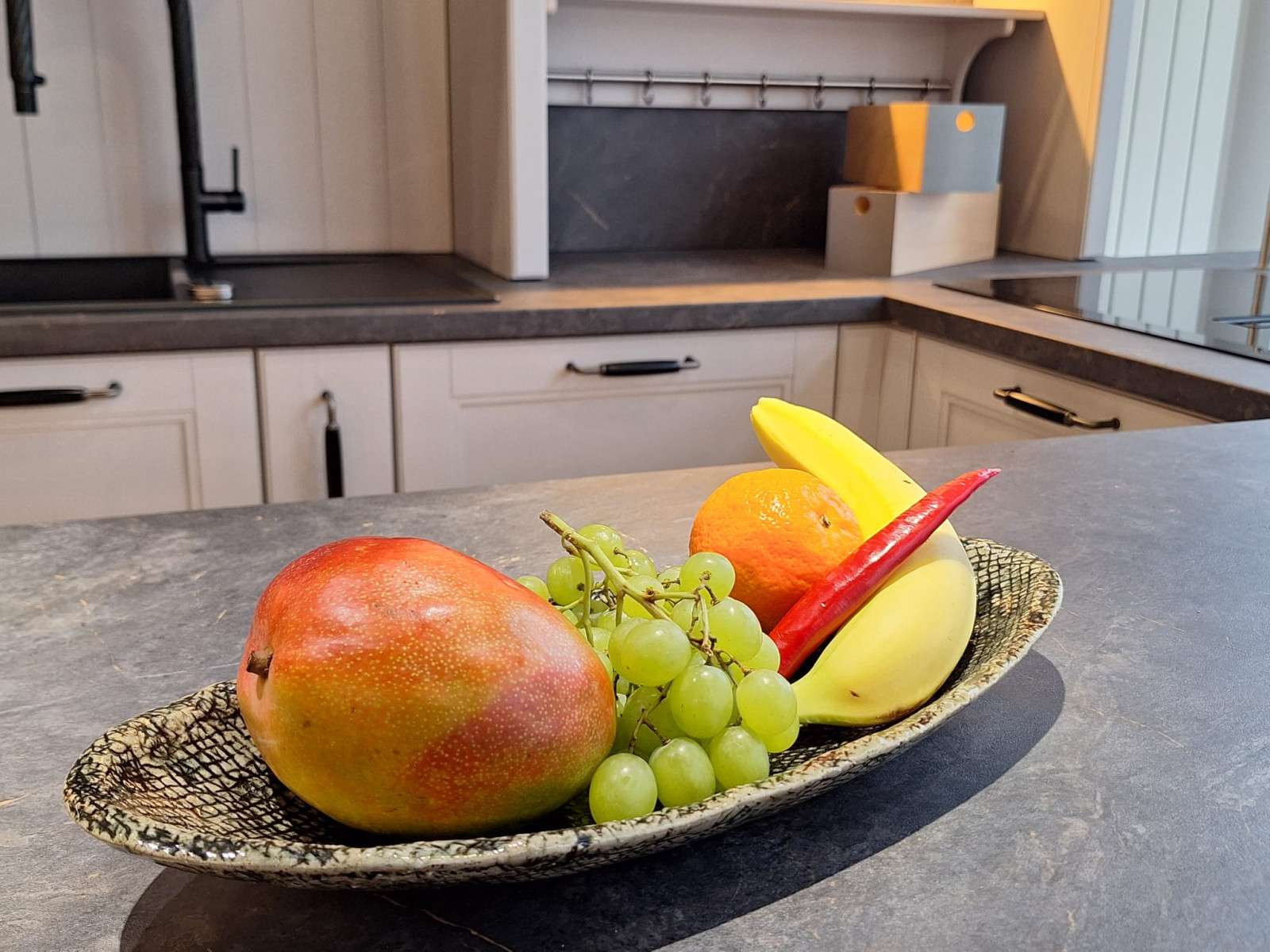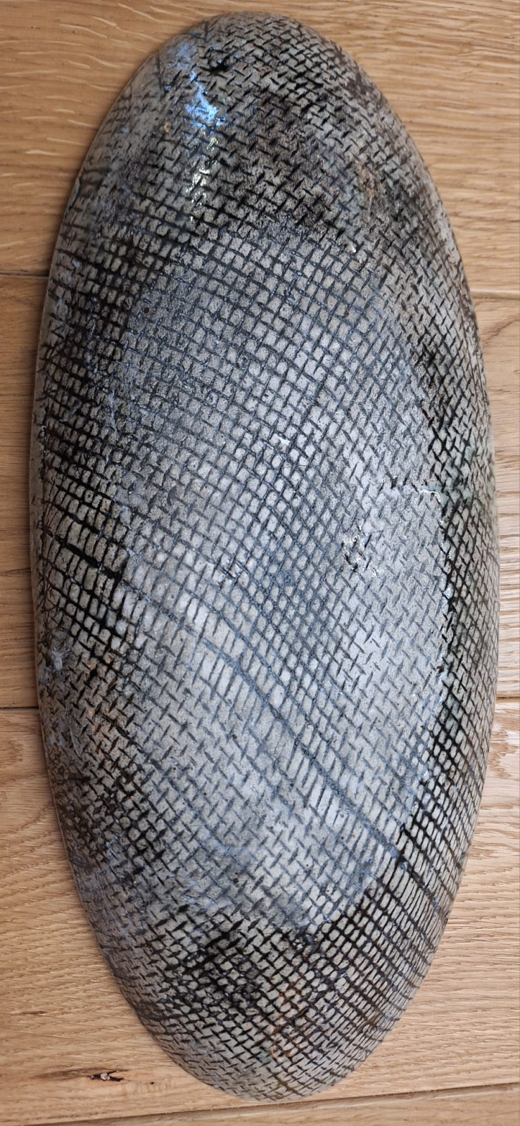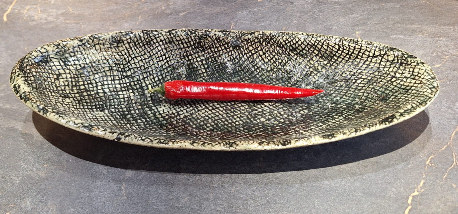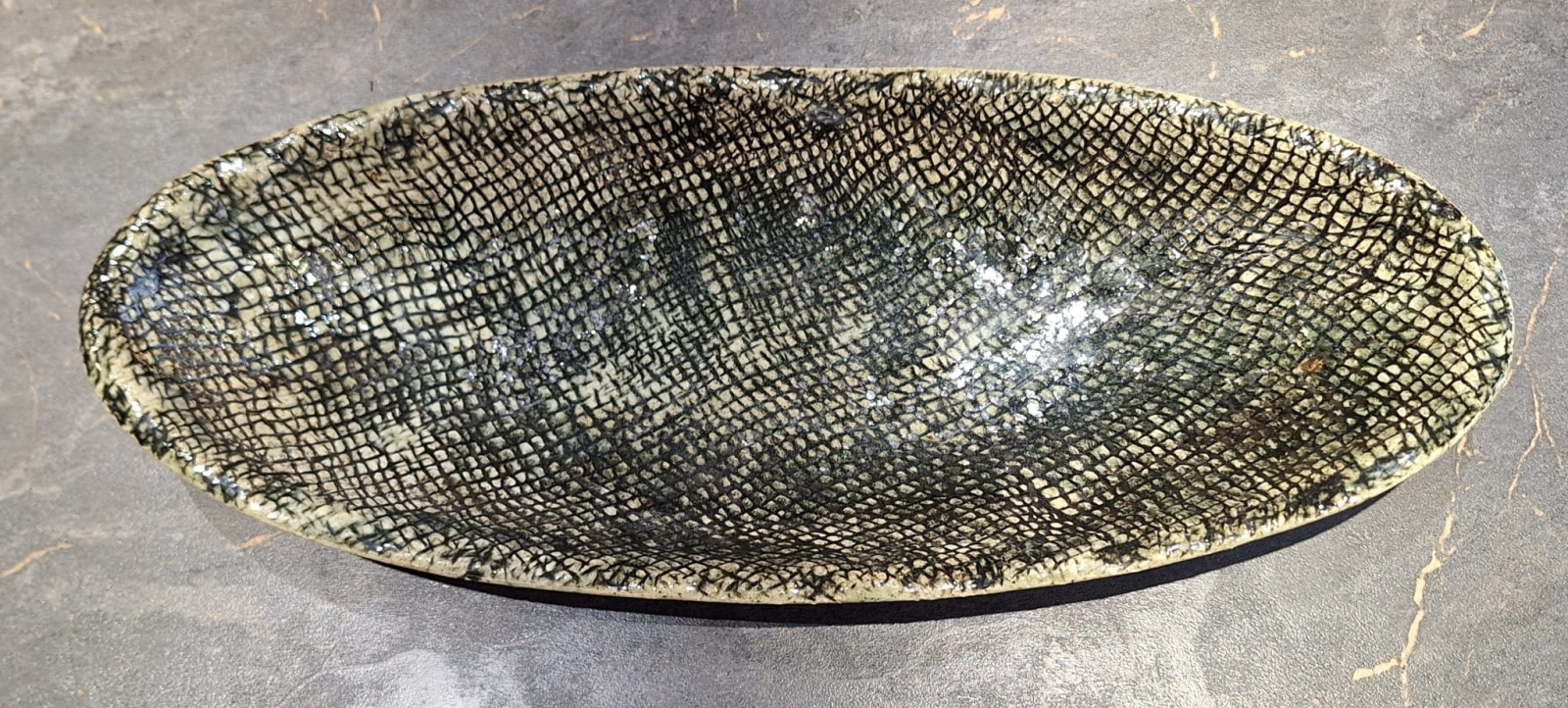Patera ceramiczna w tonacji brązów, czerni, szarości. Wypalana dwukrotnie na kamionkę w temperaturze 1240 stopni. Szkliwa dopuszczone do kontaktu z żywnością. Można myć w zmywarce. Wymiary 39cm x 16 cm x 5,5 cm