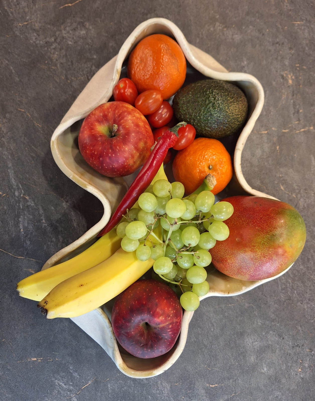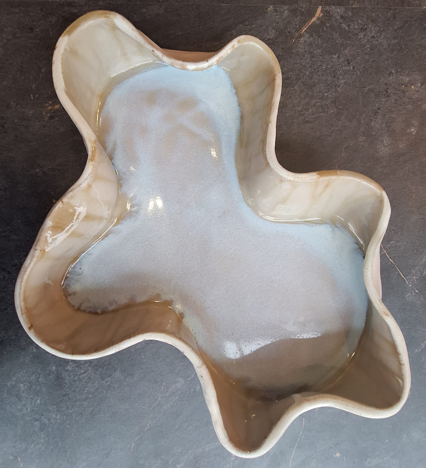 Patera ceramiczna w tonacji brązów, beżów, bieli, szarości. Wypalana dwukrotnie na kamionkę w temperaturze 1240 stopni. Szkliwa dopuszczone do kontaktu z żywnością. Można myć w zmywarce. Wymiary 42cm x 32cm x 8 cm
