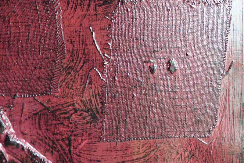Obraz akrylowy, technika mieszana, podłoże płyta ,przygotowany do powieszenia bez potrzeby ramy i dodatkowych mocowań, fakturalny, boki zamalowane w tonacji obrazu, werniksowany, sygnowany, wymiar 39,5 cm x 39,5 cm x 2 cm Tonacja bordowo-czarna.