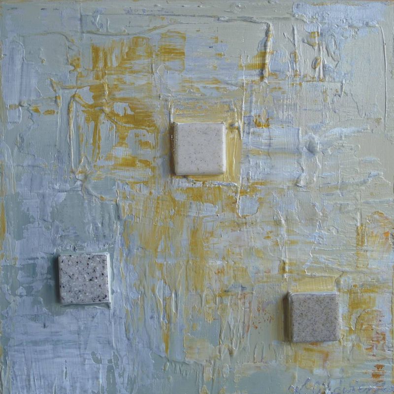Obraz akrylowy, kolaż, elementy akrylu, podłoże płyta, krawędzie zamalowane w tonacji obrazu, ,werniksowany, sygnowany, przygotowany do powieszenia w dowolnej pozycji, powierzchnia obrazu fakturalna. Wymiar 40cm x 40 cm.