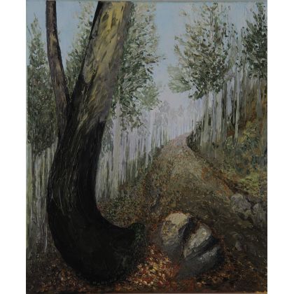 Obraz olejny na płótnie, malowany szpachlą. Przedstawia szlak górski w Bieszczadach.